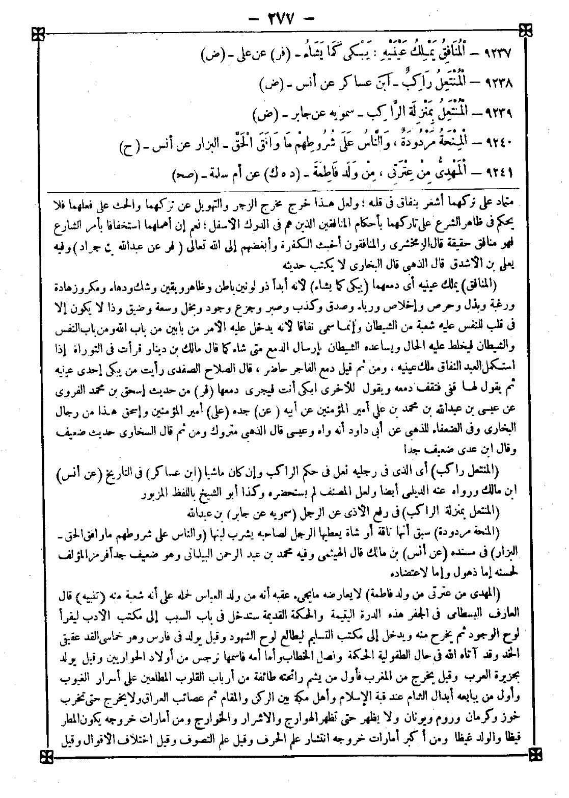 9237 - (المنافق) يملك عينيه أي دمعهما (يبكي كما يشاء) لأنه أبدا ذو لونين باطن وظاهر ويقين وشك ودهاء ومكر وزهادة ورغبة وبذل وحرص وإخلاص ورياء وصدق وكذب وصبر وجزع وجود وبخل وسعة وضيق وذا لا يكون إلا في قلب للنفس عليه شعبة من الشيطان وإنما سمي نفاقا لأنه دخل عليه الأمر من بابين من باب الله ومن باب النفس والشيطان فيخلط عليه الحال ويساعده الشيطان بإرسال الدمع متى شاء كما قال مالك بن دينار: قرأت في التوراة إذا استكمل العبد النفاق ملك عينيه ومن ثم قيل دمع الفاجر حاضر قال الصلاح الصفدي: رأيت من يبكي إحدى عينيه ثم يقول لها قفي فتقف دمعه ويقول للأخرى ابكي أنت فيجري دمعها