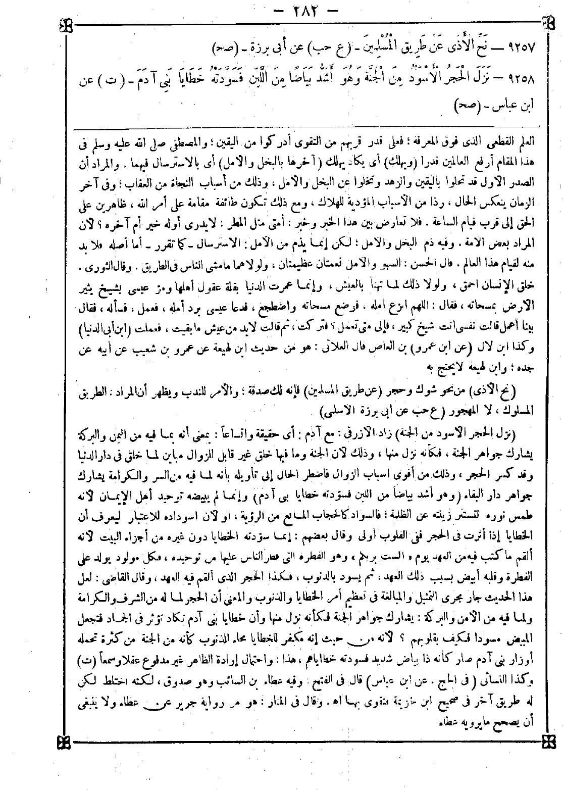 9258 - (نزل الحجر الأسود من الجنة) زاد الآزرقي: مع آدم: أي حقيقة واتساعا: بمعنى أنه بما فيه من اليمن والبركة يشارك جواهر الجنة فكأنه نزل منها وذلك لأن الجنة وما فيها خلق غير قابل للزوال مباين لما خلق في دار الدنيا وقد كسر الحجر وذلك من أقوى أسباب الزوال فاضطر الحال إلى تأويله بأنه لما فيه من السر والكرامة يشارك جواهر دار البقاء (وهو أشد بياضا من اللبن فسودته خطايا بني آدم) وإنما لم يبيضه توحيد أهل الإيمان لأنه طمس نوره لتستر زينته عن الظلمة فالسواد كالحجاب المانع من الرؤية أو لأن اسوداده للاعتبار ليعرف أن الخطايا إذا أثرت في الحجر ففي القلوب أولى وقال بعضهم: إنما سودته الخطايا دون غيره من أجزاء البيت لأنه ألقم ما كتب فيه من العهد يوم {ألست بربكم} وهو الفطرة التي فطر الناس عليها من توحيده فكل مولود يولد على الفطرة وقلبه أبيض بسبب ذلك العهد ثم يسود بالذنوب فكذا الحجر الذي ألقم فيه العهد وقال القاضي: لعل هذا الحديث جار مجرى التمثيل والمبالغة في تعظيم أمر الخطايا والذنوب والمعنى أن الحجر لما له من الشرف والكرامة ولما فيه من الأمن والبركة يشارك جواهر الجنة فكأنه نزل منها وأن خطايا بني آدم تكاد تؤثر في الجماد فتجعل المبيض مسودا فكيف بقلوبهم؟ لأنه من حيث إنه مكفر للخطايا محاء الذنوب كأنه من الجنة من كثرة تحمله أوزار بني آدم صار كأنه ذا بياض شديد فسودته خطاياهم هذا واحتمال إرادة الظاهر غير مدفوع عقلا وسمعا