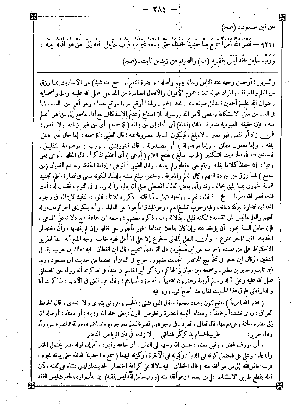 وقيل: معناه حسن الله وجهه في الناس أي جاهه وقدره ثم إن قوله نضر يحتمل الخبر والدعاء وعلى كل فيحتمل كونه في الدنيا وكونه في الآخرة وكونه فيهما (سمع منا حديثا فحفظه حتى يبلغه غيره فرب حامل فقه إلى من هو أفقه منه) قال الخطابي: فيه دلالة على كراهة اختصار الحديث لمن ليس بمتناه في الفقه لأن فعله يقطع طريق الاستنباط على من بعده ممن هو أفقه منه (ورب حامل فقه ليس بفقيه) بين به أن راوي الحديث ليس الفقه -[285]- من شرطه إنما شرطه الحفظ أما الفهم والتدبر فعلى الفقيه وهذا أقوى دليل على رد قبول من شرط لقبول الرواية كون الراوي فقيها عالما وقسم التحمل إلى شيئين: لأن حامل الحديث لا يخلو إما أن يكون فقيها أو غير فقيه والفقيه إما أن يكون غيره أفقه أو لا فانقسم بذلك إليهما. وفيه كالذي قبله على أن أساس كل خير حسن الاستماع {ولو علم الله فيهم خيرا لأسمعهم} وقد حقق العارفون أن كلام الله رسالة من الله لعبيده ومخاطبة لهم وهو البحر المشتمل على جواهر العلم المتضمن لظاهره وباطنه. ولهذا قاموا بأدب سماعه ورعوه حق رعايته وقد تجلى لخلقه في كلامه {لو كانوا يعقلون} وكذا كلام رسوله مما يتعين حسن الاستماع لأنه لا ينطق عن الهوى