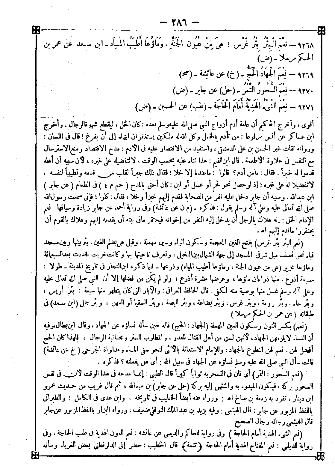 9268 - (نعم البئر بئر غرس) بفتح الغين المعجمة وسكون الراء وسين مهملة وقيل هي بضم الغين. بئر بينها وبين مسجد قباء نحو نصف ميل شرقي المسجد إلى جهة الشمال بين النخيل وتعرف ناحيتها بها وكانت خربت فجددت بعد السبع مئة وماؤها غزير (هي من عيون الجنة وماؤها أطيب المياه) وذرعها فيما ذكره ابن النجار في تاريخ المدينة طولا: سبعة أذرع منها ذراعان ماؤها وعرضها عشرة أذرع ولو لم يكن من فضلها إلا أن النبي صلى الله تعالى عليه وعلى آله وسلم غسل منها بوصية منه لكفى. قال الحافظ العراقي: والآبار التي كان يتطهر منها سبعة: بئر أريس وبئر حاء وبئر رومة وبئر غرس وبئر بضاعة وبئر البصة وبئر السقيا أو العهن وبئر جمل