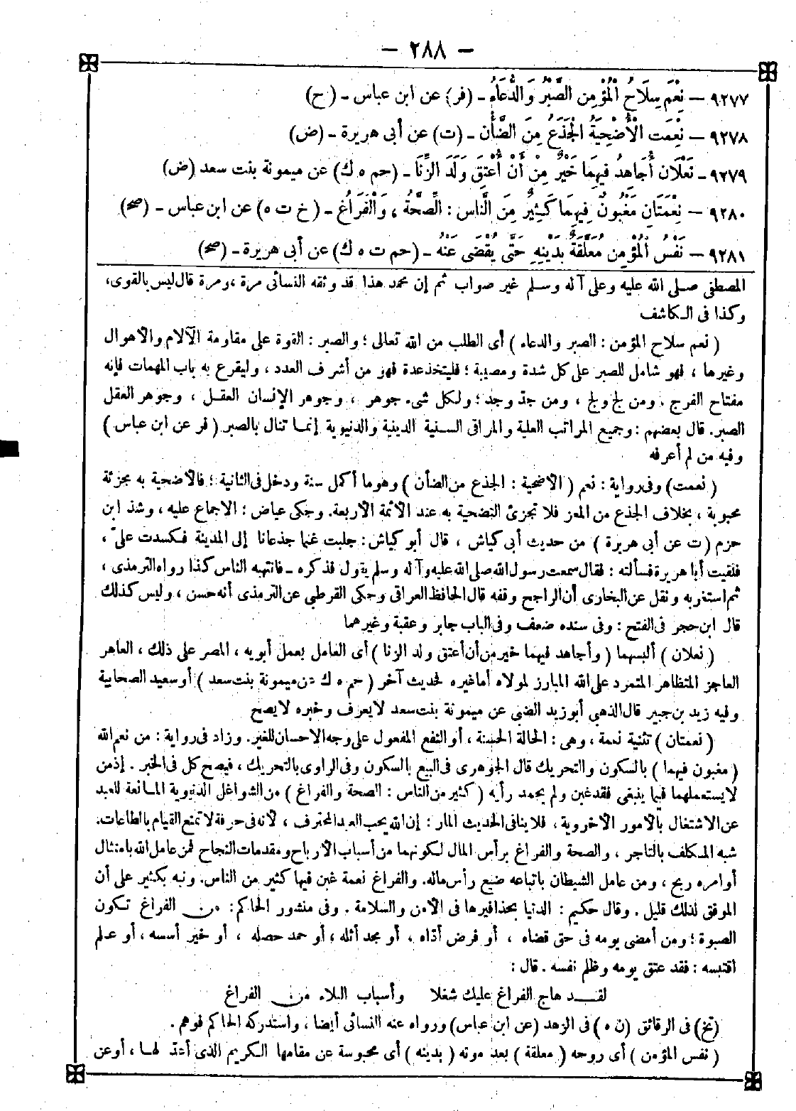 9280 - (نعمتان) تثنية نعمة وهي الحالة الحسنة أو النفع المفعول على وجه الإحسان للغير. وزاد في رواية " من نعم الله " (مغبون فيهما) بالسكون والتحريك قال الجوهري: في البيع بالسكون وفي الراوي بالتحريك فيصح كل في الخبر. إذ من لا يستعملهما فيما ينبغي فقد غبن ولم يحمد رأيه (كثير من الناس: الصحة والفراغ) من الشواغل الدنيوية المانعة للعبد عن الاشتغال بالأمور الآخروية فلا ينافي الحديث المار: إن الله يحب العبد المحترف لأنه في حرفة لا تمنع القيام بالطاعات. شبه المكلف بالتاجر والصحة والفراغ برأس المال لكونهما من أسباب الأرباح ومقدمات النجاح فمن عامل الله بامتثال أوامره ربح ومن عامل الشيطان باتباعه ضيع رأس ماله. والفراغ نعمة غبن فيها كثير من الناس. ونبه بكثير على أن الموفق لذلك قليل. وقال حكيم: الدنيا بحذافيرها في الأمن والسلامة. وفي منشور الحكم: من الفراغ تكون الصبوة ومن أمضى يومه في حق قضاه أو فرض أداه أو مجد أثله أو حمد حصله أو خير أسسه أو علم اقتبسه فقد عتق يومه وظلم نفسه. قال: