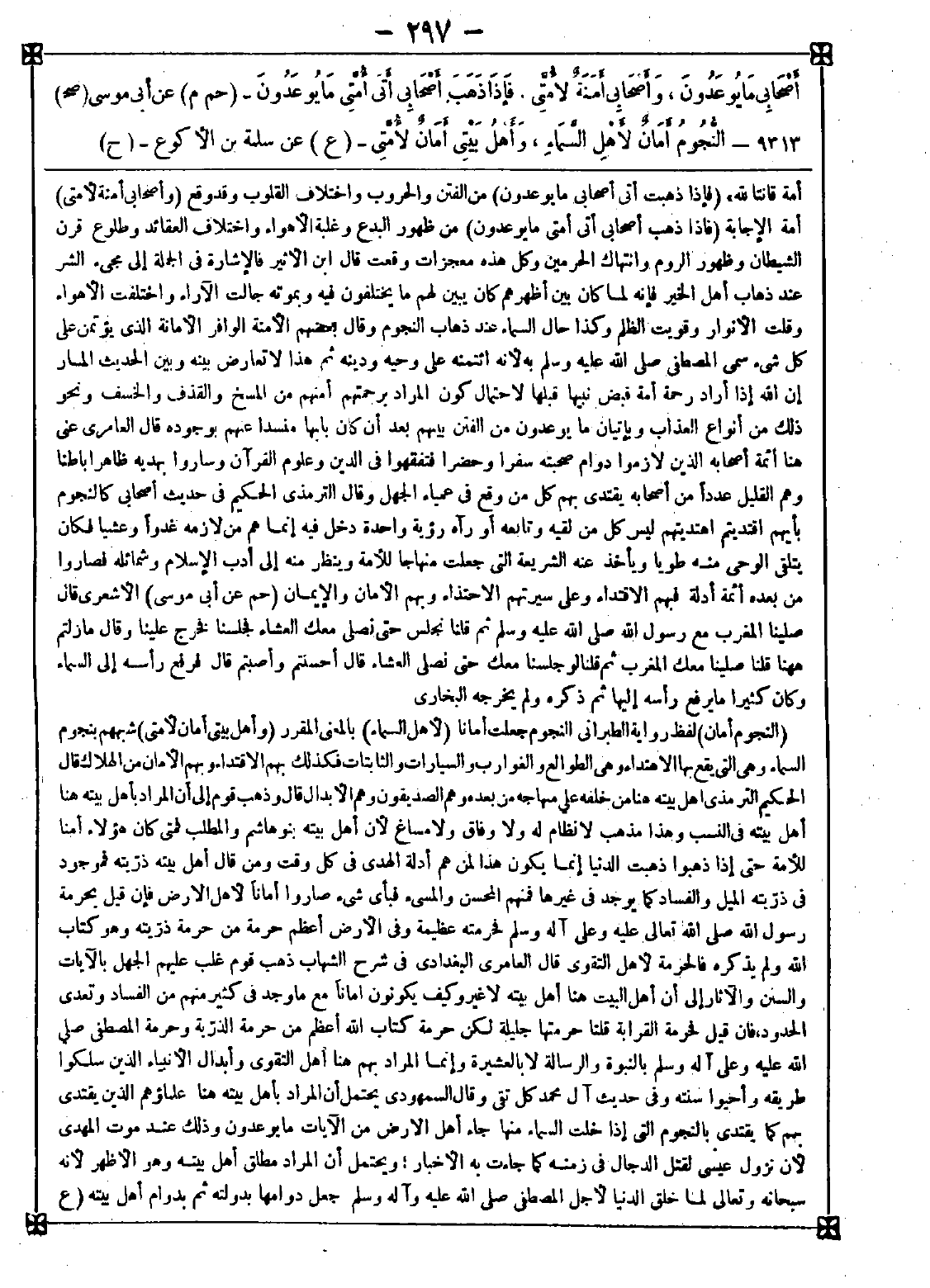 9313 - (النجوم أمان) لفظ رواية الطبراني النجوم جعلت أمانا (لأهل السماء) بالمعنى المقرر (وأهل بيتي أمان لأمتي) شبههم بنجوم السماء وهي التي يقع بها الاهتداء وهي الطوالع والغوارب والسيارات والثابتات فكذلك بهم الاقتداء وبهم الأمان من الهلاك قال الحكيم الترمذي: أهل بيته هنا من خلفه على منهاجه من بعده وهم الصديقون وهم الأبدال قال: وذهب قوم إلى أن المراد بأهل بيته هنا أهل بيته في النسب وهذا مذهب لا نظام له ولا وفاق ولا مساغ لأن أهل بيته بنو هاشم والمطلب فمتى كان هؤلاء أمنا للأمة حتى إذا ذهبوا ذهبت الدنيا إنما يكون هذا لمن هم أدلة الهدى في كل وقت ومن قال أهل بيته ذريته فموجود في ذريته الميل والفساد كما يوجد في غيرها فمنهم المحسن والمسيء فبأي شيء صاروا أمانا لأهل الأرض فإن قيل بحرمة رسول الله صلى الله تعالى عليه وعلى آله وسلم فحرمته عظيمة وفي الأرض أعظم حرمة من حرمة ذريته وهو كتاب الله ولم يذكره فالحرمة لأهل التقوى قال العامري البغدادي في شرح الشهاب: ذهب قوم غلب عليهم الجهل بالآيات والسنن والآثار إلى أن أهل البيت هنا أهل بيته لا غير وكيف يكونون أمانا مع ما وجد في كثير منهم من الفساد وتعدي الحدود فإن قيل فحرمة القرابة قلنا حرمتها جليلة لكن حرمة كتاب الله أعظم من حرمة الذرية وحرمة المصطفى صلى الله عليه وعلى آله وسلم بالنبوة والرسالة لا بالعشيرة وإنما المراد بهم هنا أهل التقوى وأبدال الأنبياء الذين سلكوا طريقه وأحيوا سنته وفي حديث آل محمد كل تقى وقال السمهودي: يحتمل أن المراد بأهل بيته هنا علماؤهم الذين يقتدى بهم كما يقتدى بالنجوم التي إذا خلت السماء منها جاء أهل الأرض من الآيات ما يوعدون وذلك عند موت المهدي لأن نزول عيسى لقتل الدجال في زمنه كما جاءت به الأخبار ويحتمل أن المراد مطلق أهل بيته وهو الأظهر لأنه سبحانه وتعالى لما خلق الدنيا لأجل المصطفى صلى الله عليه وآله وسلم جعل دوامها بدولته ثم بدوام أهل بيته