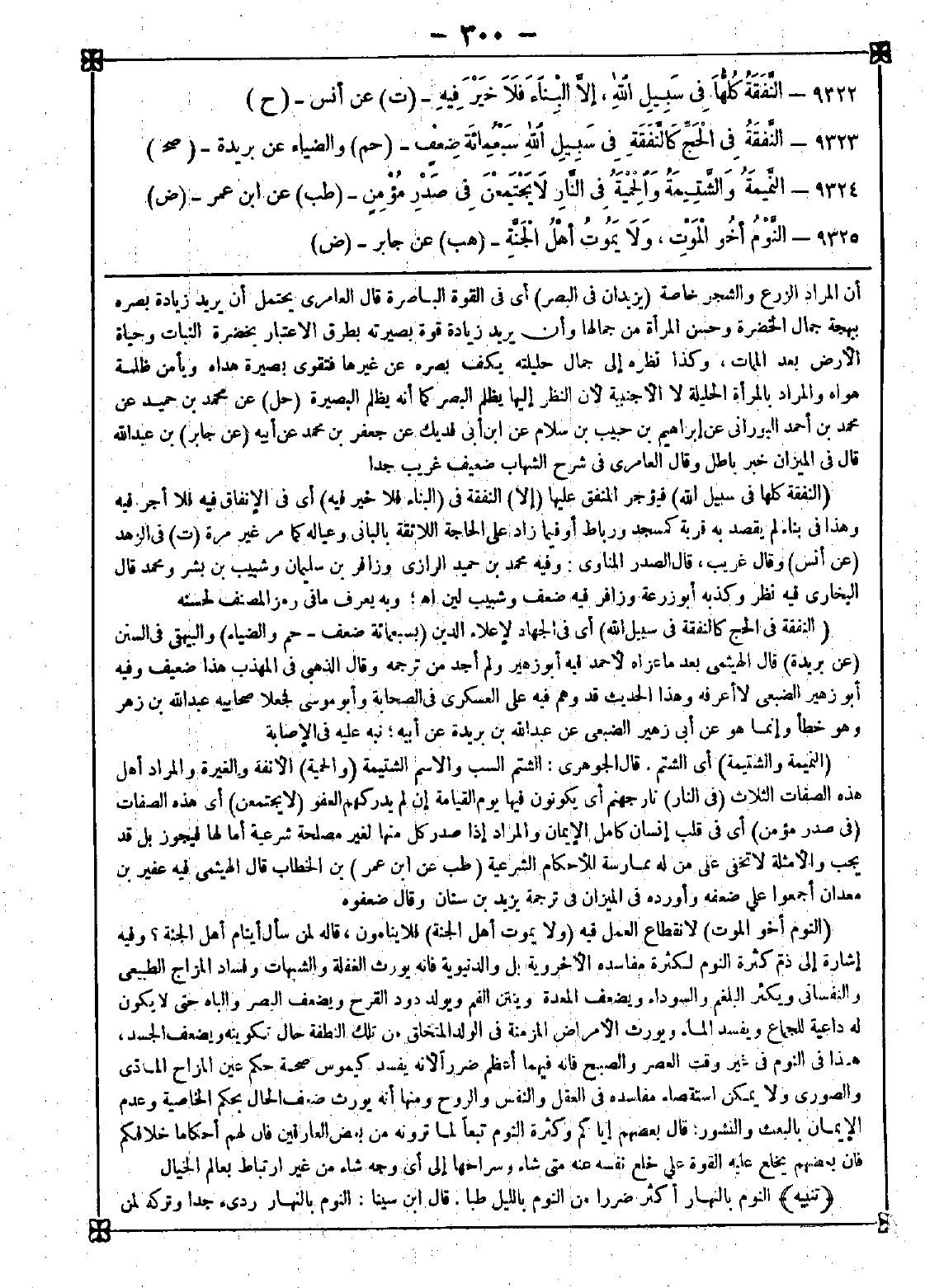 9322 - (النفقة كلها في سبيل الله) فيؤجر المنفق عليها (إلا) النفقة في (البناء فلا خير فيه) أي في الإنفاق فيه فلا أجر فيه وهذا في بناء لم يقصد به قربة كمسجد ورباط أو فيما زاد على الحاجة اللائقة بالباني وعياله كما مر غير مرة