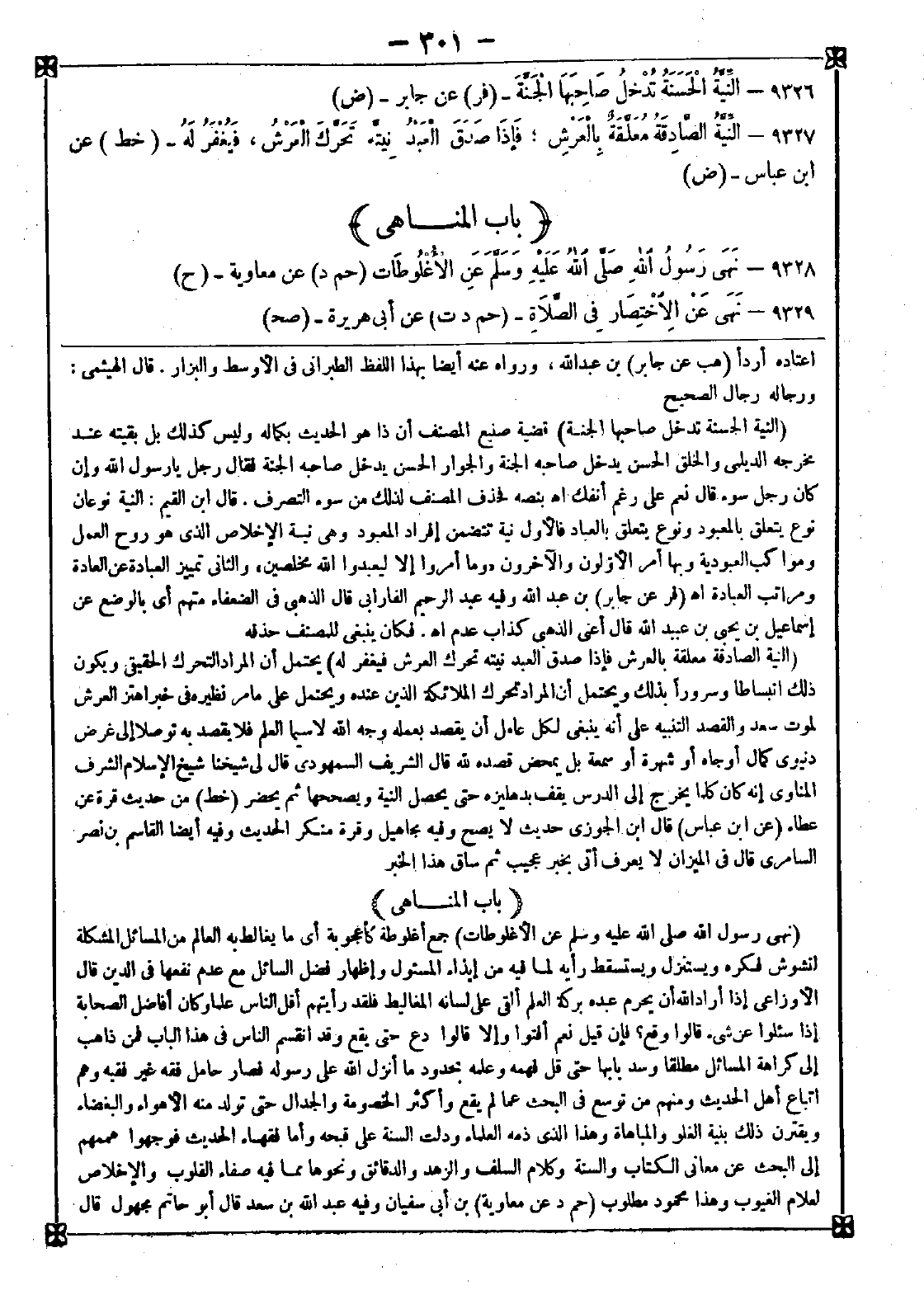 9326 - (النية الحسنة تدخل صاحبها الجنة) قضية صنيع المصنف أن ذا هو الحديث بكماله وليس كذلك بل بقيته عند مخرجه الديلمي والخلق الحسن يدخل صاحبه الجنة والجوار الحسن يدخل صاحبه الجنة فقال رجل: يا رسول الله وإن كان رجل سوء قال: نعم على رغم أنفك اه بنصه فحذف المصنف لذلك من سوء التصرف. قال ابن القيم: النية نوعان نوع يتعلق بالمعبود ونوع يتعلق بالعباد فالأول نية تتضمن إفراد المعبود وهي نية الإخلاص الذي هو روح العمل ومواكب العبودية وبها أمر الأولون والآخرون {وما أمروا إلا ليعبدوا الله مخلصين} والثاني تمييز العبادة عن العادة ومراتب العبادة اه