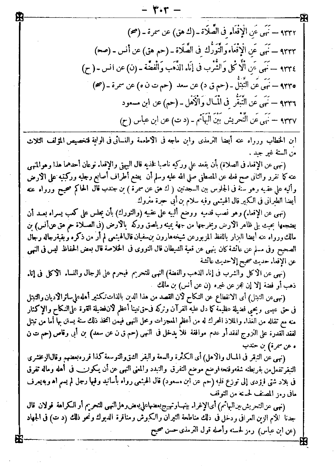 9333 - (نهى عن الإقعاء) وهو نصب قدميه ووضع ألييه على عقبيه (والتورك) بأن يجلس على كعب يسراه بعد أن يضجعها بحيث يلي ظاهر الأرض ويخرجها من جهة يمينه ويلصق وركه بالأرض (في الصلاة)