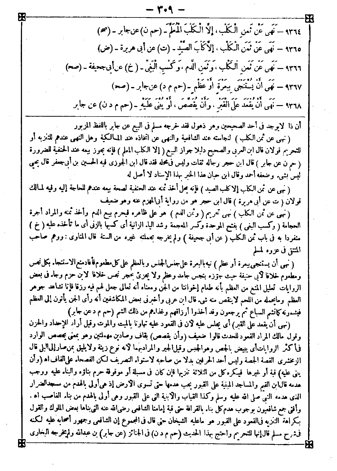 9364 - (نهى عن ثمن الكلب) لنجاسته عند الشافعية والنهي عن اتخاذه عند المالكية وهل النهي عندهم للتنزيه أو للتحريم قولان قال ابن العربي: والصحيح دليلا جواز البيع (إلا الكلب المعلم) فإنه يجوز بيعه عند الحنفية للضرورة