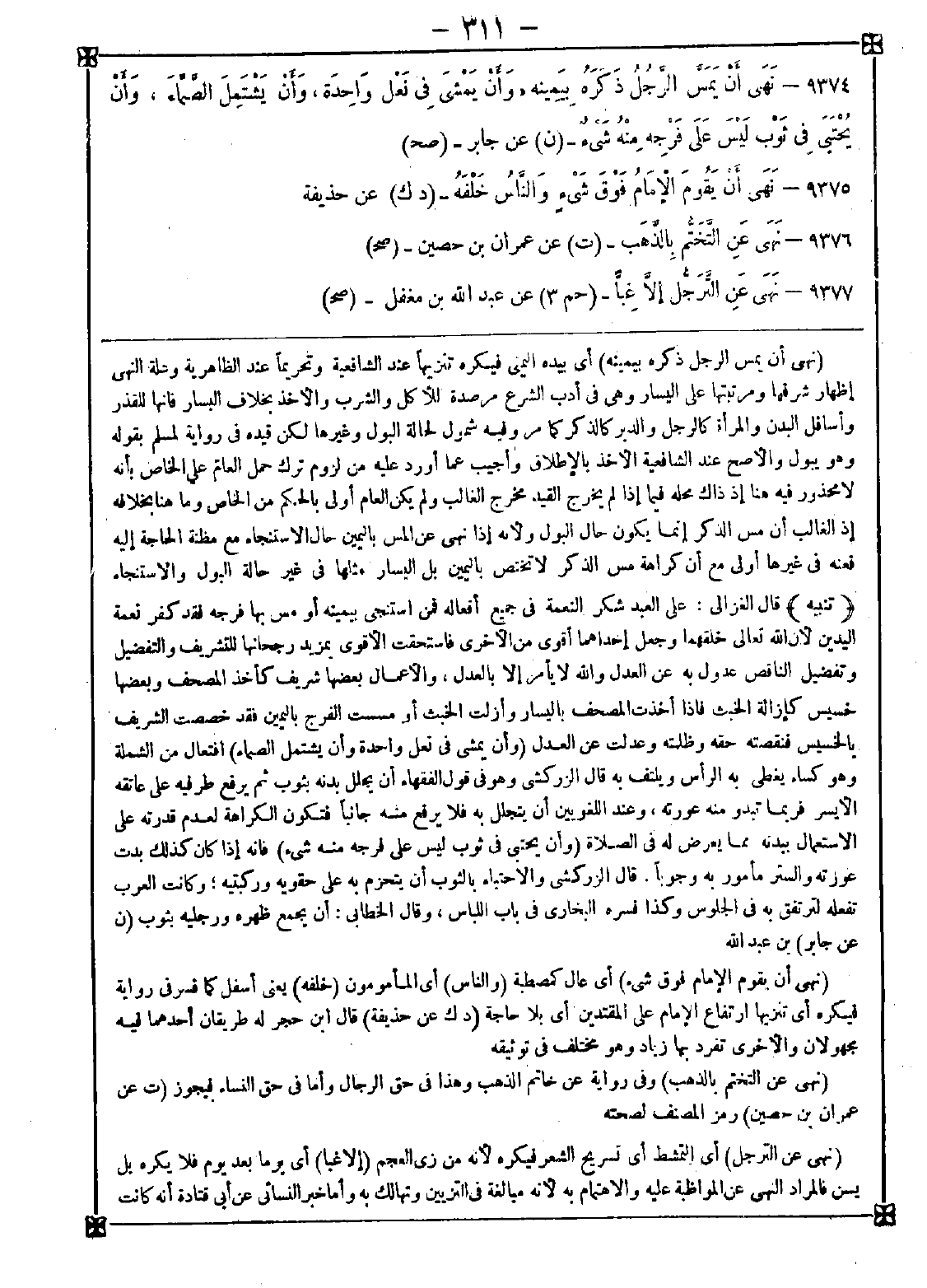 -[311]- 9374 - (نهى أن يمس الرجل ذكره بيمينه) أي بيده اليمنى فيكره تنزيها عند الشافعية وتحريما عند الظاهرية وعلة النهي إظهار شرفها ومرتبتها على اليسار وهي في أدب الشرع مرصدة للأكل والشرب والأخذ بخلاف اليسار فإنها للقذر وأسافل البدن والمرأة كالرجل والدبر كالذكر كما مر وفيه شمول لحالة البول وغيرها لكن قيده في رواية لمسلم بقوله وهو يبول والأصح عند الشافعية الأخذ بالإطلاق وأجيب عما أورد عليه من لزوم ترك حمل العام على الخاص بأنه لا محذور فيه هنا إذ ذاك محله فيما إذا لم يخرج القيد مخرج الغالب ولم يكن العام أولى بالحكم من الخاص وما هنا بخلافه إذ الغالب أن مس الذكر إنما يكون حال البول ولأنه إذا نهى عن المس باليمين حال الاستنجاء مع مظنة الحاجة إليه فعنه في غيرها أولى مع أن كراهة مس الذكر لا تختص باليمين بل اليسار مثلها في غير حالة البول والاستنجاء