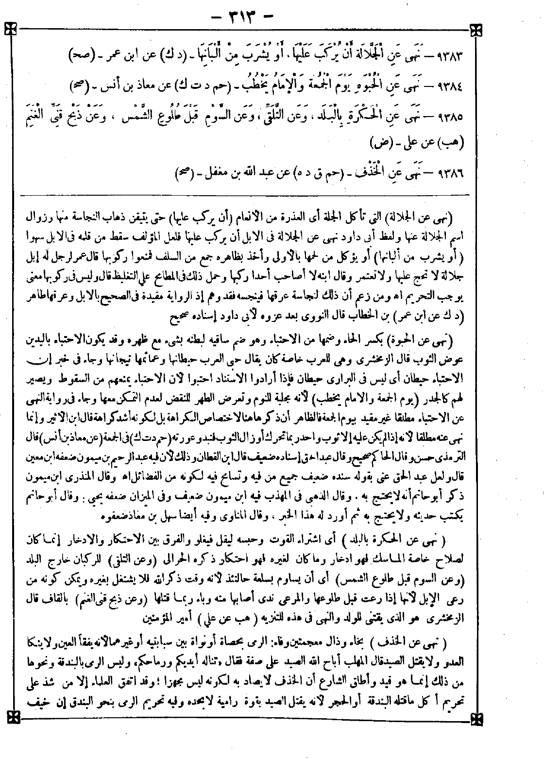-[313]- 9383 - (نهى عن الجلالة) التي تأكل الجلة أي العذرة من الأنعام (أن يركب عليها) حتى يتيقن ذهاب النجاسة منها وزوال اسم الجلالة عنها ولفظ أبي داود نهى عن الجلالة في الإبل أن يركب عليها فلعل المؤلف سقط من قلمه في الإبل سهوا (أو يشرب من ألبانها) أو يؤكل من لحمها بالأولى وأخذ بظاهره جمع من السلف فمنعوا ركوبها قال عمر لرجل له إبل جلالة: لا تحج عليها ولا تعتمر وقال ابنه: لا أصاحب أحدا ركبها وحمل ذلك في المطامح على التغليظ قال: وليس في ركوبها معنى يوجب التحريم اه ومن زعم أن ذلك لنجاسة عرقها فينجسه فقد وهم إذ الرواية مقيدة في الصحيح بالإبل وعرقها طاهر
