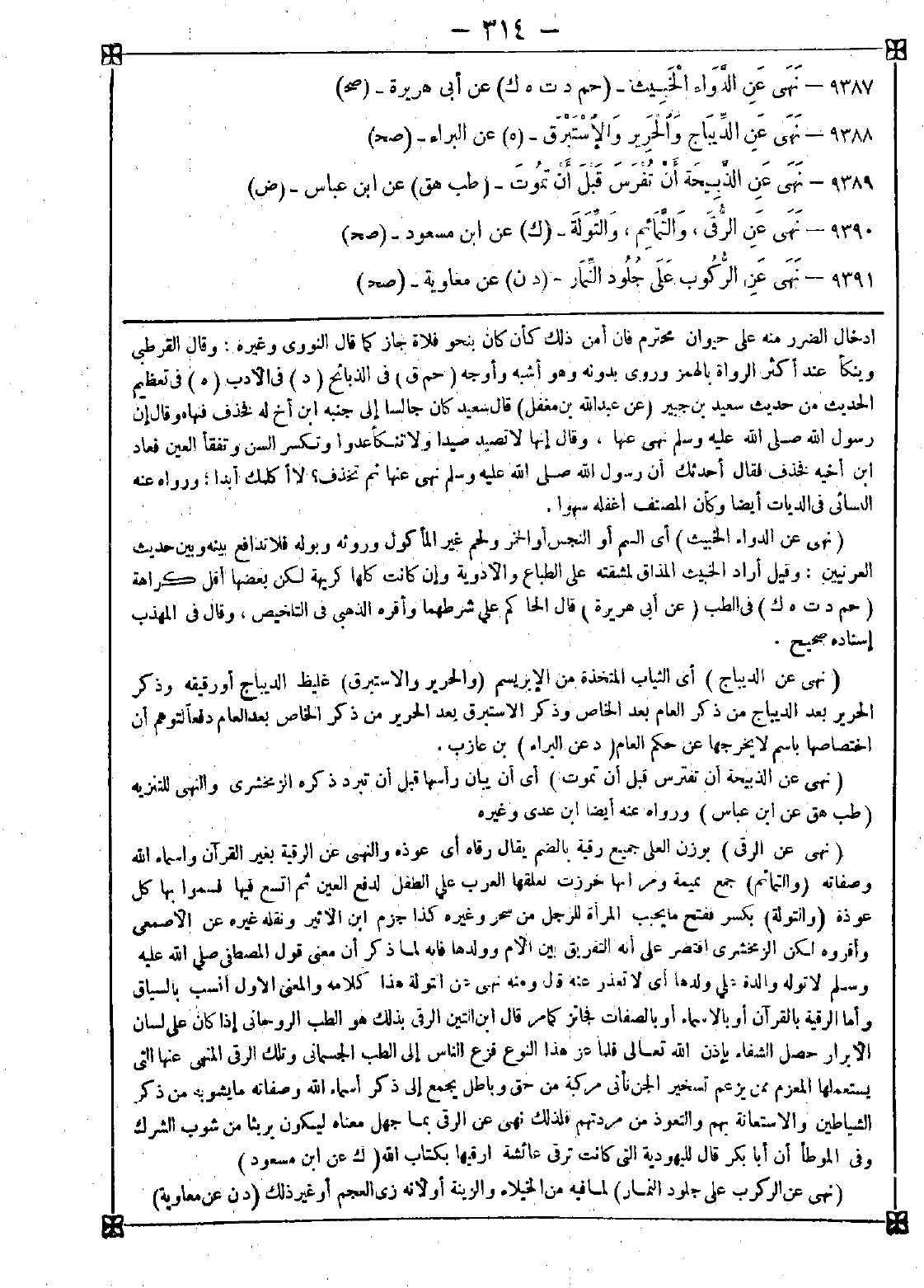 9388 - (نهى عن الديباج) أي الثياب المتخذة من الإبريسم (والحرير والإستبرق) غليظ الديباج أو رقيقه وذكر الحرير بعد الديباج من ذكر العام بعد الخاص وذكر الإستبرق بعد الحرير من ذكر الخاص بعد العام دفعا لتوهم أن اختصاصها باسم لا يخرجها عن حكم العام
