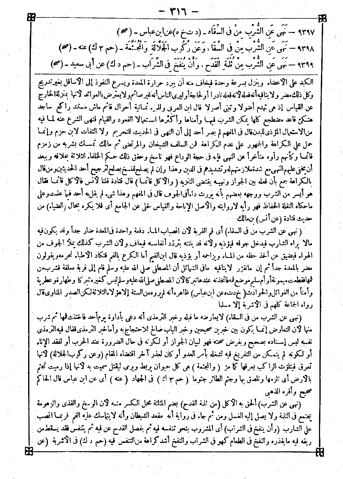 9397 - (نهى عن الشرب من في السقاء) أي فم القربة لأن انصباب الماء دفعة واحدة في المعدة ضار جدا وقد يكون فيه ما لا يراه الشارب فيدخل جوفه فيؤذيه ولأنه قد ينتنه بتردد أنفاسه فيعاف ولأن الشرب كذلك يملأ الجوف من الهواء فيضيق عن أخذ حظه من الماء ويزاحمه أو يؤذيه قال ابن القيم: أما الكرع بالفم فتكاد الأطباء تحرمه ويقولون مضر بالمعدة جدا ثم إن ما تقرر لا ينافيه ما في الشمائل أن المصطفى صلى الله عليه وسلم قام إلى قربة معلقة فشرب من فمها فقطعت ميمونة أو أم سليم موضع فمه فاتخذته عندها تبركا لأن المصطفى صلى الله عليه وسلم ليس كغيره تبركا وطهارة وعطرية وأمنا من الغوائل والحوادث