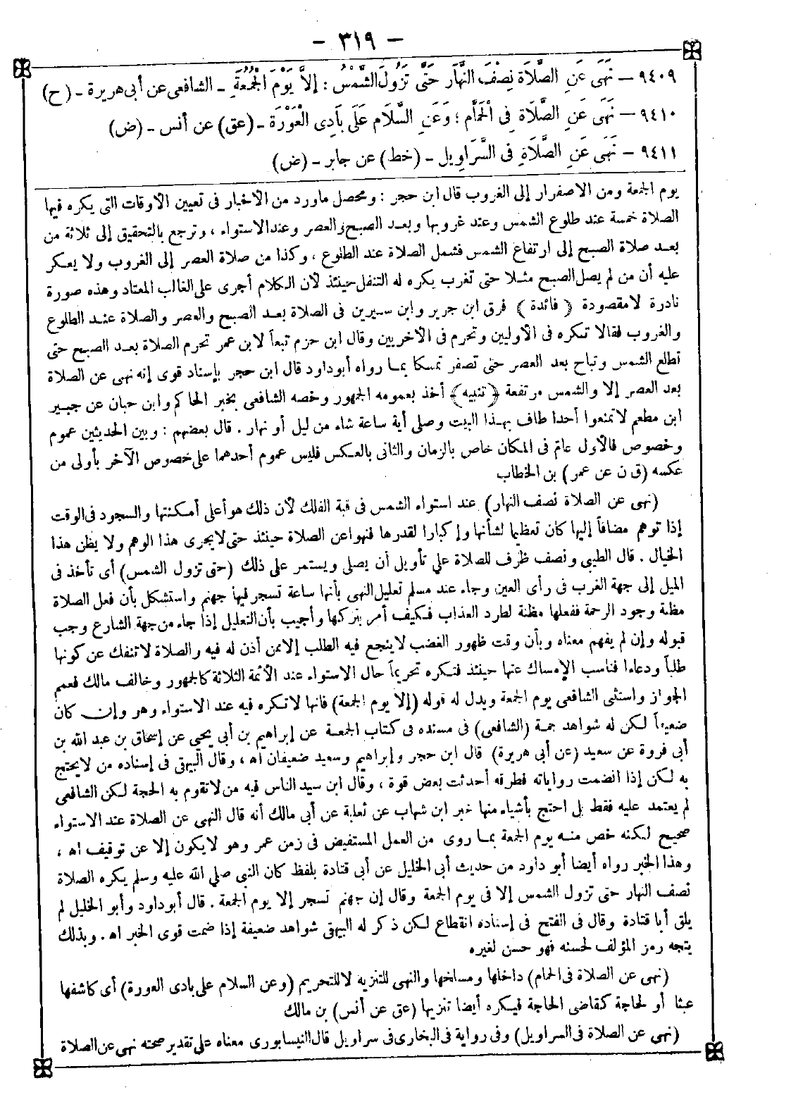 9409 - (نهى عن الصلاة نصف النهار) عند استواء الشمس في قبة الفلك لأن ذلك هو أعلى أمكنتها والسجود في الوقت إذا توهم مضافا إليها كان تعظيما لشأنها وإكبارا لقدرها فنهوا عن الصلاة حينئذ حتى لا يجري هذا الوهم ولا يظن هذا الخيال. قال الطيبي: ونصف ظرف للصلاة على تأويل أن يصلي ويستمر على ذلك (حتى تزول الشمس) أي تأخذ في الميل إلى جهة الغرب في رأى العين وجاء عند مسلم تعليل النهي بأنها ساعة تسجر فيها جهنم واستشكل بأن فعل الصلاة مظنة وجود الرحمة ففعلها مظنة لطرد العذاب فكيف أمر بتركها وأجيب بأن التعليل إذا جاء من جهة الشارع وجب قبوله وإن لم يفهم معناه وبأن وقت ظهور الغضب لا ينجع فيه الطلب إلا ممن أذن له فيه والصلاة لا تنفك عن كونها طلبا ودعاءا فناسب الإمساك عنها حينئذ فتكره تحريما حال الاستواء عند الأئمة الثلاثة كالجمهور وخالف مالك فعمم الجواز واستثنى الشافعي يوم الجمعة ويدل له قوله (إلا يوم الجمعة) فإنها لا تكره فيه عند الاستواء وهو وإن كان ضعيفا لكن له شواهد جمة
