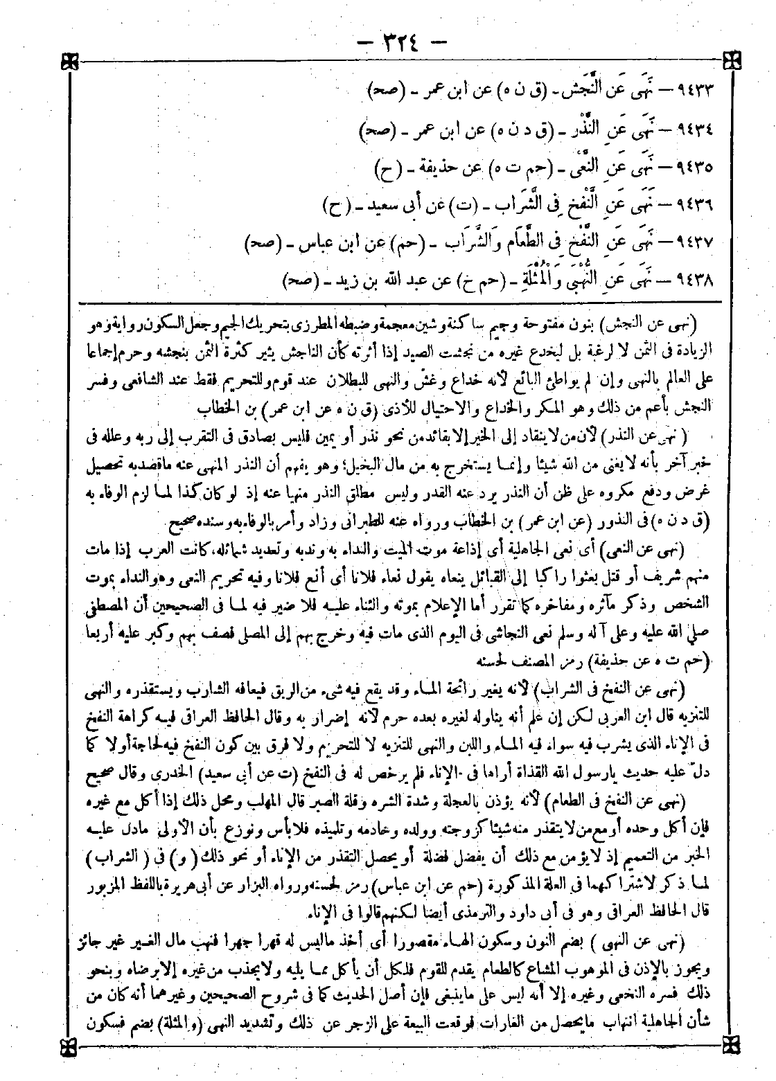 -[324]- 9433 - (نهى عن النجش) بنون مفتوحة وجيم ساكنة وشين معجمة وضبطه المطرزي بتحريك الجيم وجعل السكون رواية وهو الزيادة في الثمن لا لرغبة بل ليخدع غيره من نجشت الصيد إذا أثرته كأن الناجش يثير كثرة الثمن بنجشه وحرم إجماعا على العالم بالنهي وإن لم يواطئ البائع لأنه خداع وغش والنهي للبطلان عند قوم وللتحريم فقط عند الشافعي وفسر النجش بأعم من ذلك وهو المكر والخداع والاحتيال للأذى