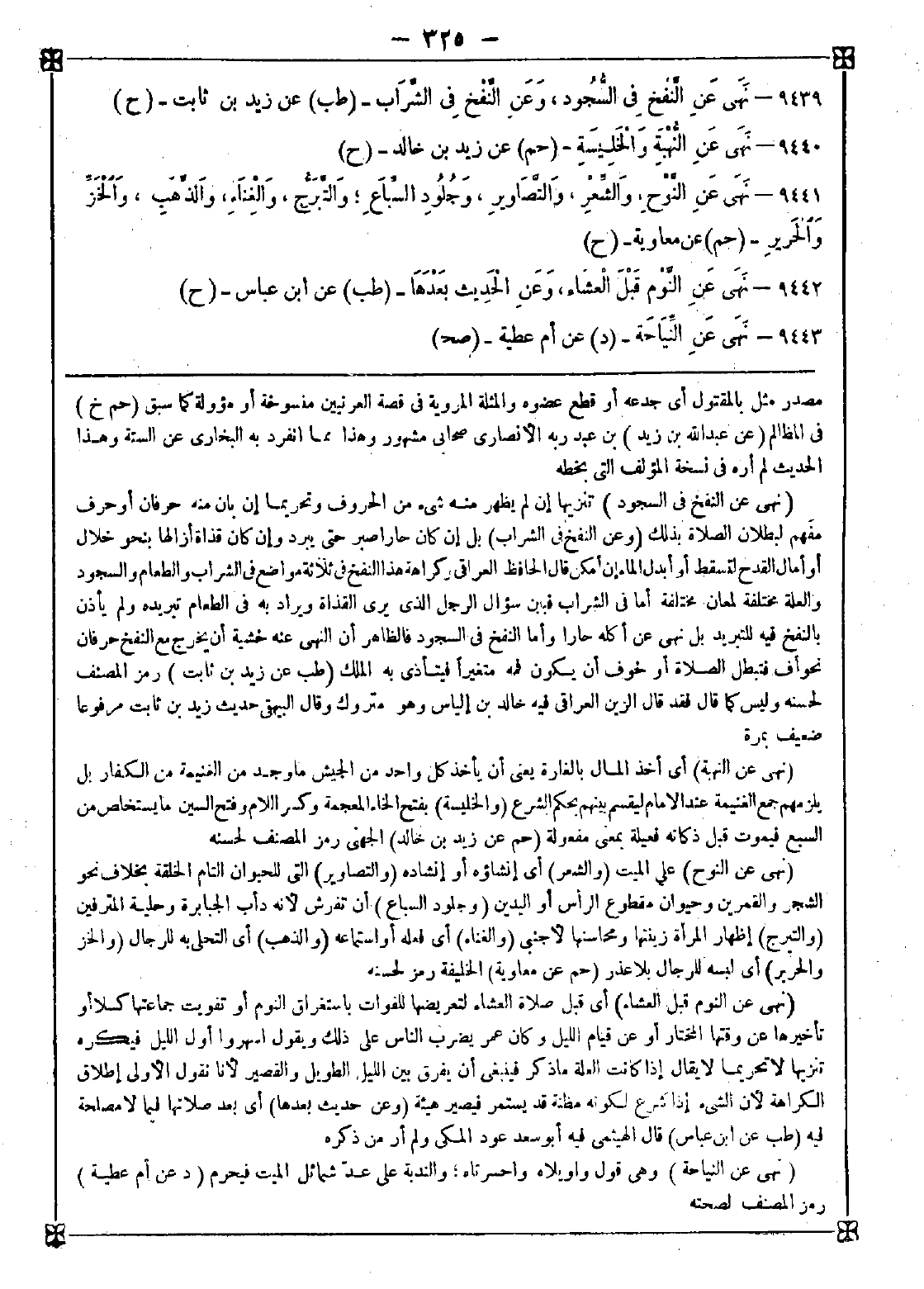 9441 - (نهى عن النوح) على الميت (والشعر) أي إنشاؤه أو إنشاده (والتصاوير) التي للحيوان التام الخلقة بخلاف نحو الشجر والقمرين وحيوان مقطوع الرأس أو اليدين (وجلود السباع) أن تفرش لأنه دأب الجبابرة وحلية المترفين (والتبرج) إظهار المرأة زينتها ومحاسنها لأجنبي (والغناء) أي فعله أو استماعه (والذهب) أي التحلي به للرجال (والخز والحرير) أي لبسه للرجال بلا عذر
