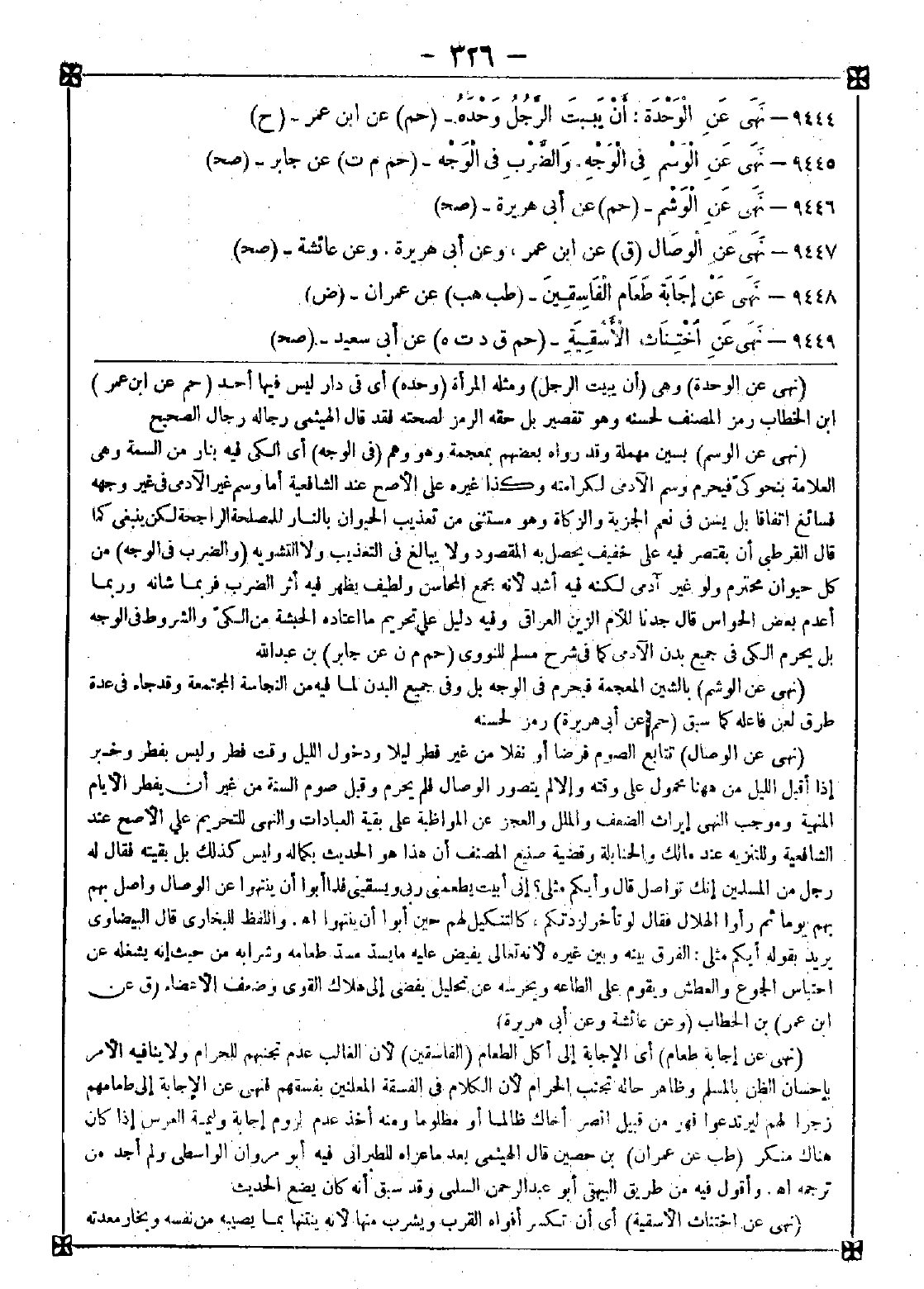9446 - (نهى عن الوشم) بالشين المعجمة فيحرم في الوجه بل وفي جميع البدن لما فيه من النجاسة المجتمعة وقد جاء في عدة طرق لعن فاعله كما سبق