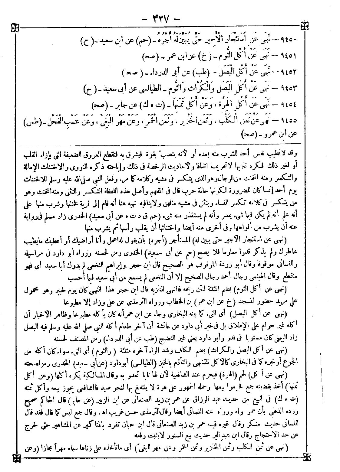 9451 - (نهى عن أكل الثوم) بضم المثلثة لنتن ريحه فالنهي للتنزيه قال ابن حجر: هذا النهي كان يوم خيبر وهو محمول على مريد حضور المسجد