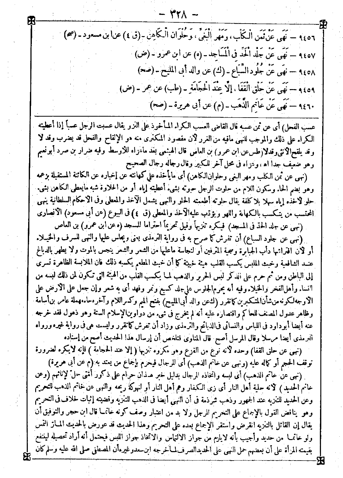 9459 - (نهى عن حلق القفا) وحده لأنه نوع من القزع وهو مكروه تنزيها (إلا عند الحجامة) فإنه لا يكره لضرورة توقف الحجم أو كماله عليه (ونهى عن خاتم الذهب) أي للرجال فيحرم بإجماع من يعتد به