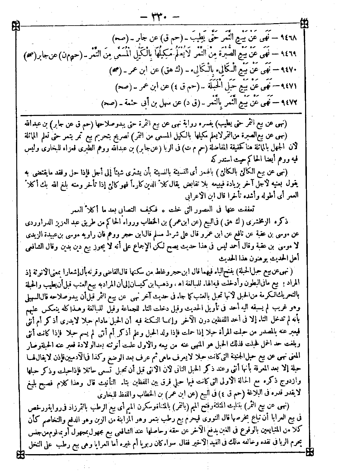 -[330]- 9468 - (نهى عن بيع الثمر حتى يطيب) يفسره رواية نهى عن بيع الثمرة حتى يبدو صلاحها