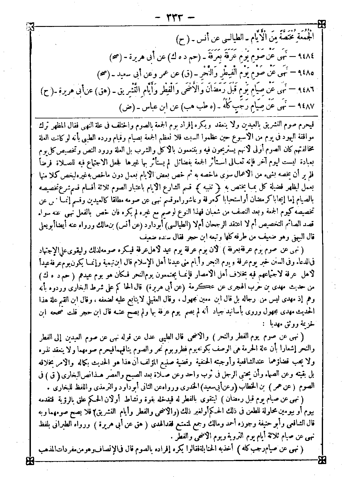 9485 - (نهى عن صوم يوم الفطر والنحر) والأضحى قال الطيبي: عدل عن قوله نهى عن صوم العيدين إلى الفطر والنحر إشعارا بأن علة الحرمة هي الوصف بكونه يوم فطر ويوم نحر والصوم ينافيهما فيحرم صومهما ولا ينعقد نذره ولا يجب قضاؤهما عند الشافعية وأوجبته الحنفية وقضية صنيع المؤلف أن هذا هو الحديث بكماله والأمر بخلافه بل بقيته وعن الصماء وأن يحتبى الرجل في ثوب واحد وعن صلاة بعد الصبح والعصر هذا نص البخاري