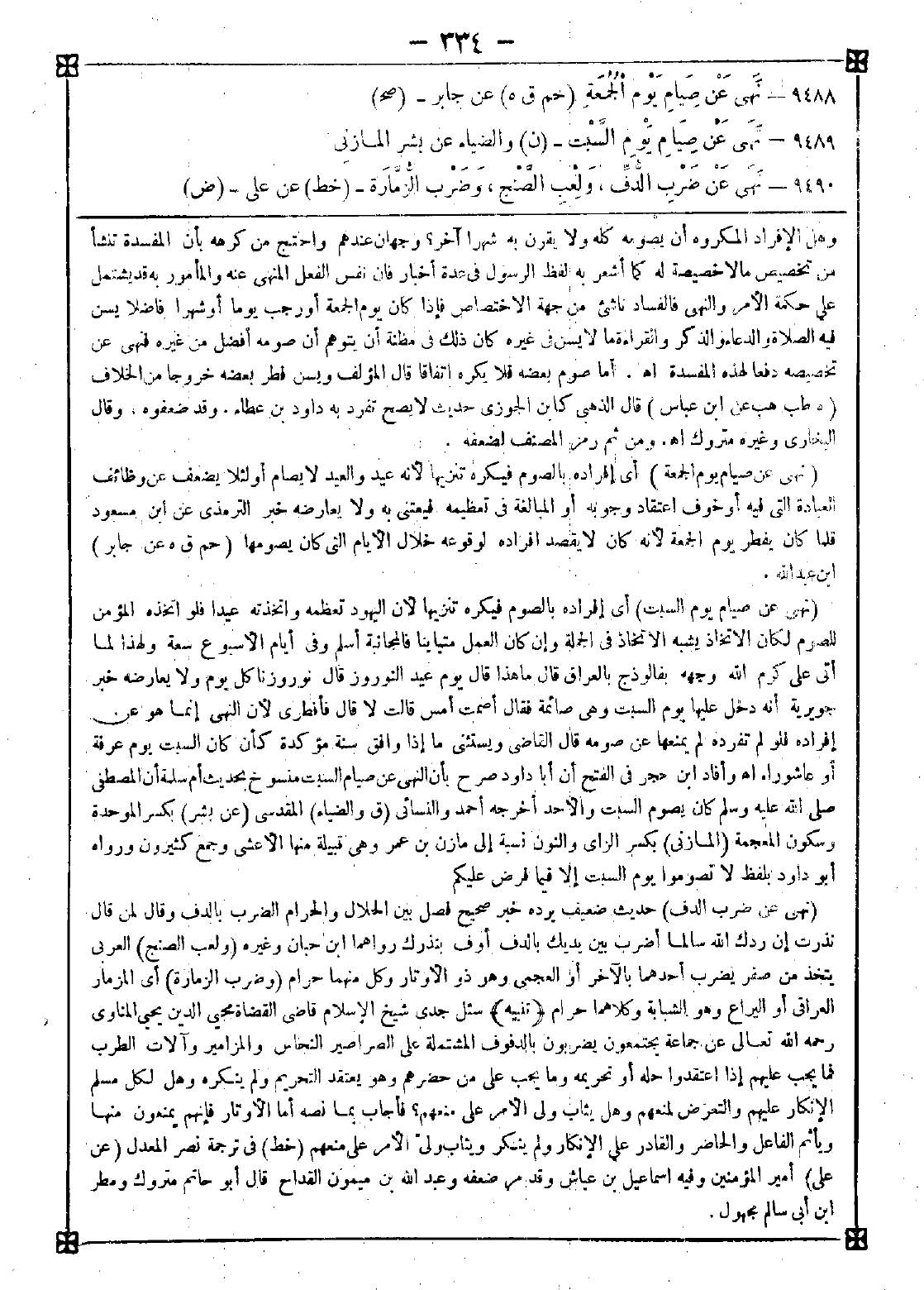 9488 - (نهى عن صيام يوم الجمعة) أي إفراده بالصوم فيكره تنزيها لأنه عيد والعيد لا يصام أو لئلا يضعف عن وظائف العبادة التي فيه أو خوف اعتقاد وجوبه أو المبالغة في تعظيمه فيعتني به ولا يعارضه خبر الترمذي عن ابن مسعود قلما كان يفطر يوم الجمعة لأنه كان لا يقصد إفراده لوقوعه خلال الأيام التي كان يصومها