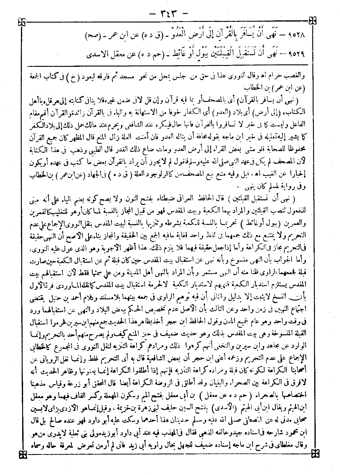 9528 - (نهى أن يسافر بالقرآن) أي بالمصحف أو بما فيه قرآن وإن قل لا في ضمن غيره فلا ينافي كتابته إلى هرقل {يا أهل الكتاب} (إلى أرض) أي بلاد (العدو) أي الكفار خوفا من الاستهانة به والباء في بالقرآن زائدة والقرآن أقيم مقام الفاعل وليست كما في خبر لا تسافروا بالقرآن فإنها حال فيكره عند الشافعي ويحرم عند مالك حمل ذلك إلى بلاد الكفر كما يشير إليه تعليله في خبر ابن ماجه بقوله مخافة أن يناله العدو فإن أمنت العلة زال المنع قال المظهر: كان جميع القرآن محفوظا للصحابة فلو مشى بعض القراء إلى أرض العدو ومات ضاع ذلك القدر قال الطيبي: وذهب في هذا الكتابة لأن المصحف لم يكن في عهد النبي صلى الله عليه وسلم فنقول لم لا يجوز أن يراد بالقرآن بعض ما كتب في عهده أو يكون إخبارا عن الغيب اه. قيل وفيه منع بيع المصحف من كافر لوجود العلة
