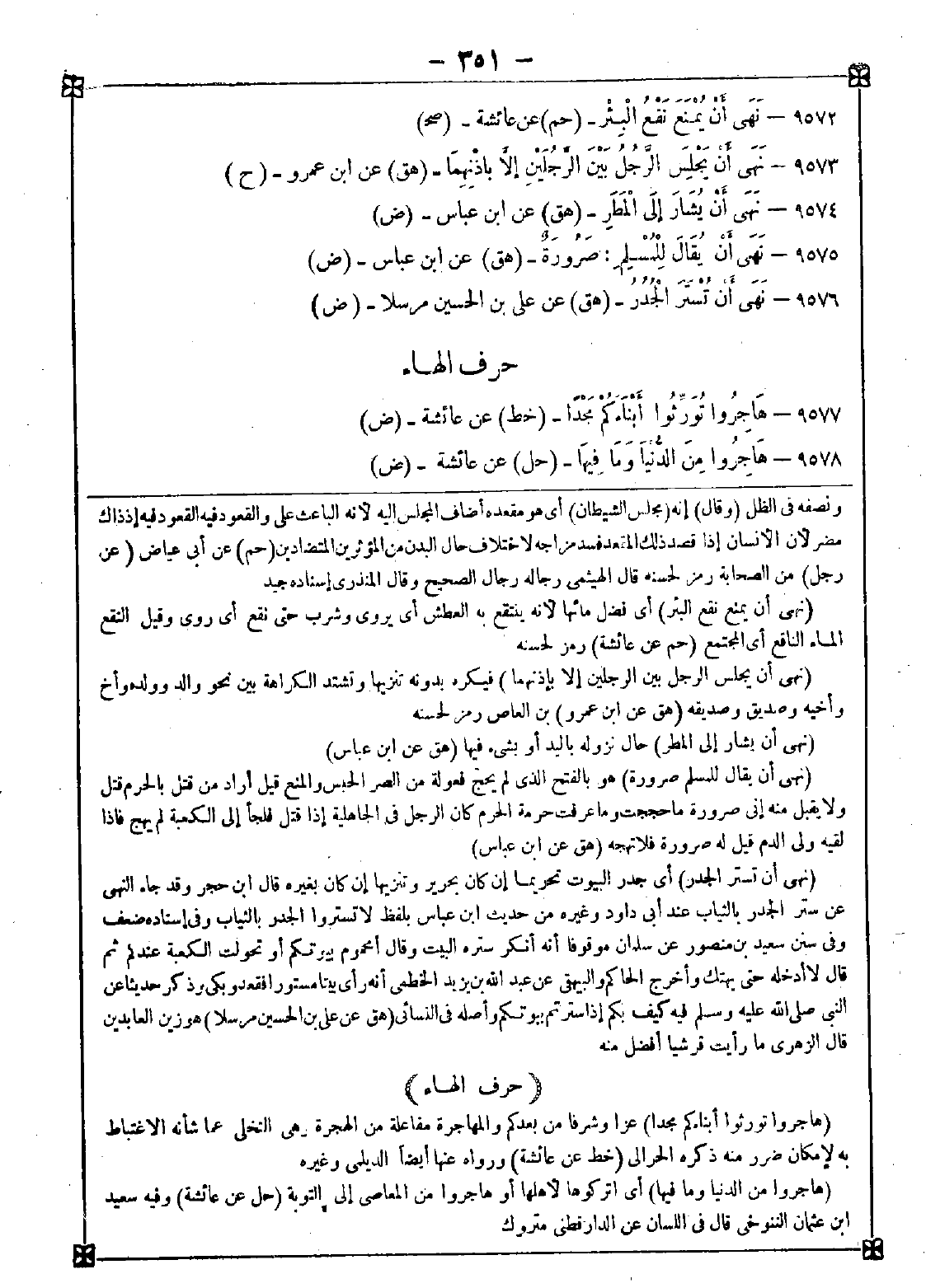 9573 - (نهى أن يجلس الرجل بين الرجلين إلا بإذنهما) فيكره بدونه تنزيها وتشتد الكراهة بين نحو والد وولده وأخ وأخيه وصديق وصديقه