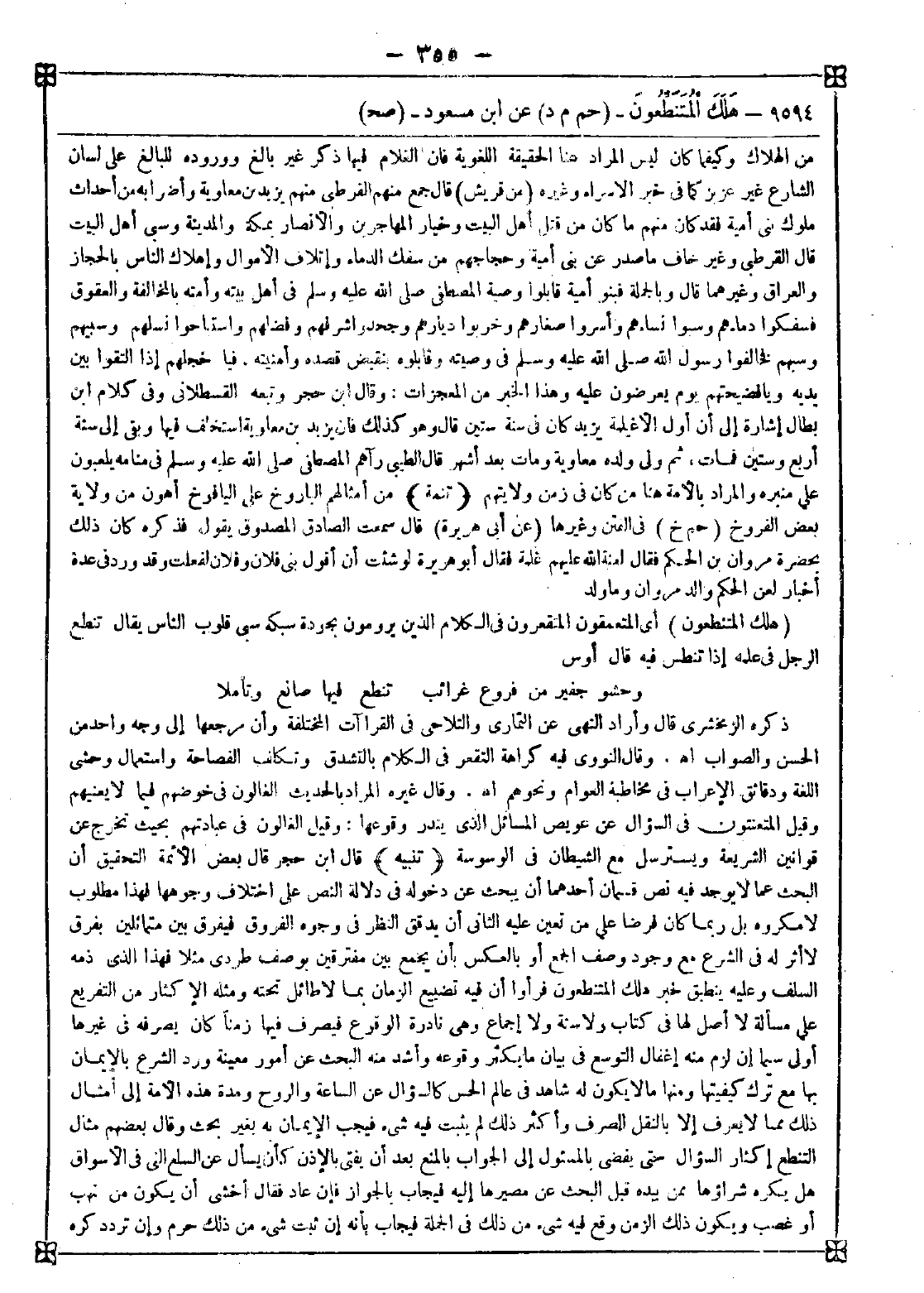 <تنبيه> قال ابن حجر: قال بعض الأئمة التحقيق أن البحث عما لا يوجد فيه نص قسمان: أحدهما أن يبحث عن دخوله في دلالة النص على اختلاف وجوهها فهذا مطلوب لا مكروه بل ربما كان فرضا على من تعين عليه الثاني أن يدقق النظر في وجوه الفروق فيفرق بين متماثلين بفرق لا أثر له في الشرع مع وجود وصف الجمع أو بالعكس بأن يجمع بين مفترقين بوصف طردي مثلا بهذا الذي ذمه السلف وعليه ينطبق خبر هلك المتنطعون فرأوا أن فيه تضييع الزمان بما لا طائل تحته ومثله الإكثار من التفريع على مسألة لا أصل لها في كتاب ولا سنة ولا إجماع وهي نادرة الوقوع فيصرف فيها زمنا كان يصرفه في غيرها أولى سيما إن لزم منه إغفال التوسع في بيان ما يكثر وقوعه وأشد منه البحث عن أمور معينة ورد الشرع بالإيمان بها مع ترك كيفيتها ومنها ما لا يكون له شاهد في عالم الحس كالسؤال عن الساعة والروح ومدة هذه الأمة إلى أمثال ذلك مما لا يعرف إلا بالنقل الصرف وأكثر ذلك لم يثبت فيه شيء فيجب الإيمان به بغير بحث وقال بعضهم: مثال التنطع إكثار السؤال حتى يفضي بالمسؤول إلى الجواب بالمنع بعد أن يفتي بالإذن كأن يسأل عن السلع التي في الأسواق هل يكره شراؤها ممن بيده قبل البحث عن مصيرها إليه فيجاب بالجواز فإن عاد فقال: أخشى أن يكون من نهب أو غصب ويكون ذلك الزمن وقع فيه شيء من ذلك في الجملة فيجاب بأنه إن ثبت شيء من ذلك حرم وإن تردد كره -[356]- أو كان خلاف الأولى ولو سكت السائل عن هذا التنطع لم يزد المفتي على جوابه بالجواز قال ابن حجر: فمن سد باب المسائل حتى فاته معرفة كثير من الأحكام التي يكثر وقوعها قل فهمه وعلمه ومن توسع في تفريع المسائل وتوليدها سيما فيما يقل وقوعها أو يندر فإنه يذم فعله