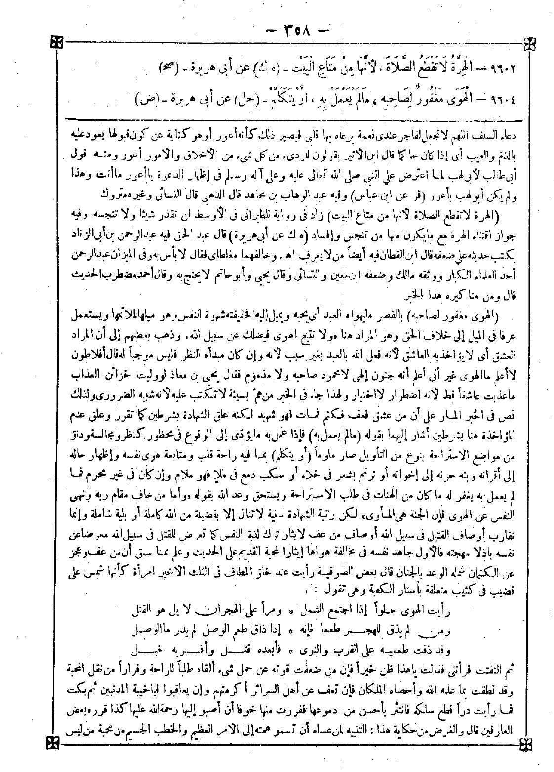 9604 - (الهوى مغفور لصاحبه) بالقصر ما يهواه العبد أي يحبه ويميل إليه فحقيقته شهوة النفس وهو ميلها لملائمها ويستعمل عرفا في الميل إلى خلاف الحق وهو المراد هنا {ولا تتبع الهوى فيضلك عن سبيل الله} وذهب بعضهم إلى أن المراد العشق أي لا يؤاخذ به العاشق لأنه فعل الله بالعبد بغير سبب لأنه وإن كان مبدأه النظر فليس موجبا له قال أفلاطون: لا أعلم ما الهوى غير أني أعلم أنه جنون إلهي لا محمود صاحبه ولا مذموم فقال يحيى بن معاذ: لو وليت خزائن العذاب ما عذبت عاشقا قط لأنه اضطرار لا اختيار ولهذا جاء في الخبر من هم بسيئة لا تكتب عليه لأنه شبيه الضروري ولذلك نص في الخبر المار على أن من عشق فعف فكتم فمات فهو شهيد لكنه علق الشهادة بشرطين كما تقرر وعلق عدم المؤاخذة هنا بشرطين أشار إليهما بقوله (ما لم يعمل به) فإذا عمل به ما يؤدي إلى الوقوع في محظور كنظر ومجالسة ودنو من مواضع الاستراحة بنوع من التأويل صار ملوما (أو يتكلم) بما فيه راحة قلب ومتابعة هوى نفسه وإظهار حاله إلى أقرانه وبثه حزنه إلى إخوانه أو ترنم بشعر في خلاء أو سكب دمع في ملأ فهو ملام وإن كان في غير محرم فما لم يعمل به يغفر له ما كان من الهنات في طلب الاستراحة ويستحق وعد الله بقوله {وأما من خاف مقام ربه ونهى النفس عن الهوى فإن الجنة هي المأوى} لكن رتبة الشهادة سنية لا تنال إلا بفضيلة من الله كاملة أو بلية شاملة وإنما تقارب أوصاف القتيل في سبيل الله أوصاف من عف لإيثار ترك لذة النفس كما تعرض للقتل في سبيل الله معرضا عن نفسه باذلا مهجته فالأول جاهد نفسه في مخالفة هواها إيثارا لمحبة القديم على الحديث وعلم مما سبق أن من عف وعجز عن الكتمان شمله الوعد بالجنان قال بعض الصوفية: رأيت عند خلو المطاف في الثلث الأخير امرأة كأنها شمس على قضيب في كثيب متعلقة بأستار الكعبة وهي تقول: