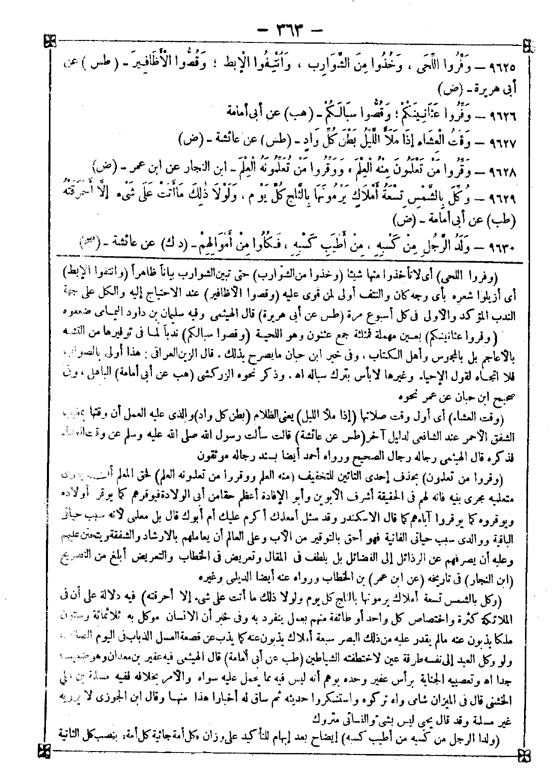 9626 - (وفروا عثانينكم) بعين مهملة فمثلثة جمع عثنون وهو اللحية (وقصوا سبالكم) ندبا لما في توفيرها من التشبه بالأعاجم بل المجوس وأهل الكتاب وفي خبر ابن حبان ما يصرح بذلك. قال الزين العراقي: هذا أولى بالصواب فلا اتجاه لقول الإحياء وغيرها لا بأس بترك سباله اه. وذكر نحوه الزركشي