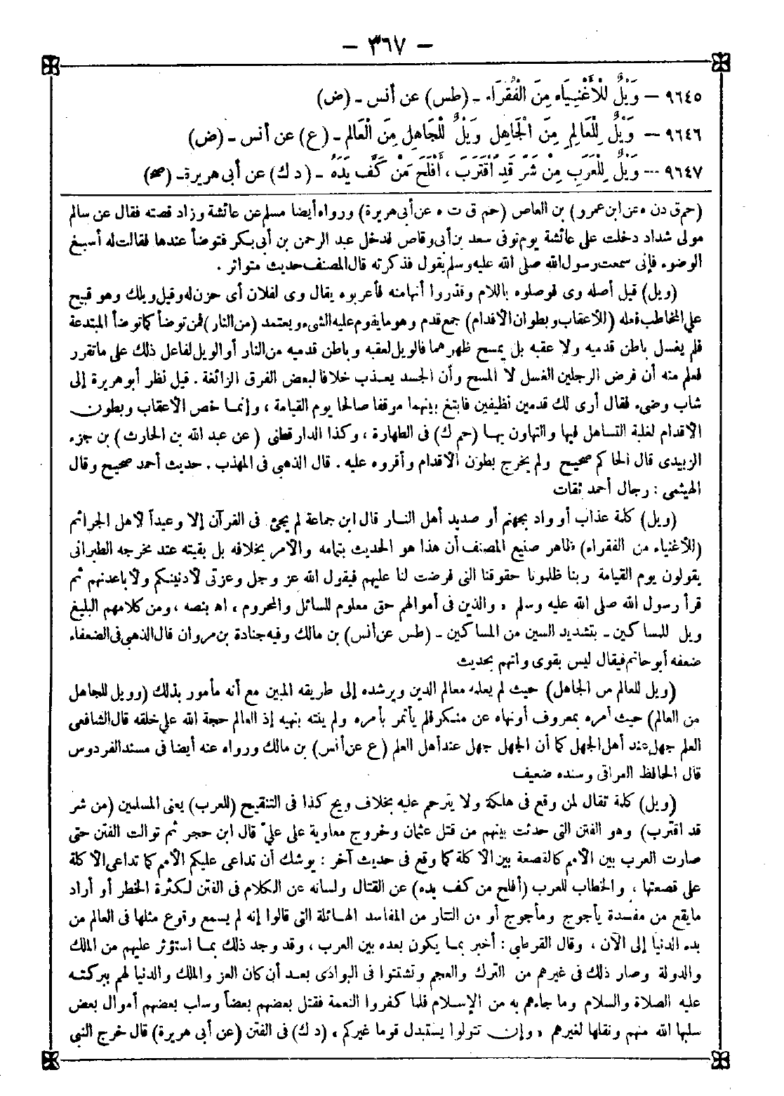 9644 - (ويل) قيل أصله وي فوصلوه باللام وقدروا أنها منه فأعربوه يقال وي لفلان أي حزن له وقيل ويلك وهو قبيح على المخاطب فعله (للأعقاب وبطون الأقدام) جمع قدم وهو ما يقوم عليه الشيء ويعتمد (من النار) فمن توضأ كما توضأ المبتدعة فلم يغسل باطن قدميه ولا عقبه بل يمسح ظهرهما فالويل لعقبه وباطن قدميه من النار أو الويل لفاعل ذلك على ما تقرر فعلم منه أن فرض الرجلين الغسل لا المسح وأن الجسد يعذب خلافا لبعض الفرق الزائغة. قيل نظر أبو هريرة إلى شاب وضيء فقال أرى لك قدمين نظيفين فابتغ بينهما موقفا صالحا يوم القيامة وإنما خص الأعقاب وبطون الأقدام لغلبة التساهل فيها والتهاون بها
