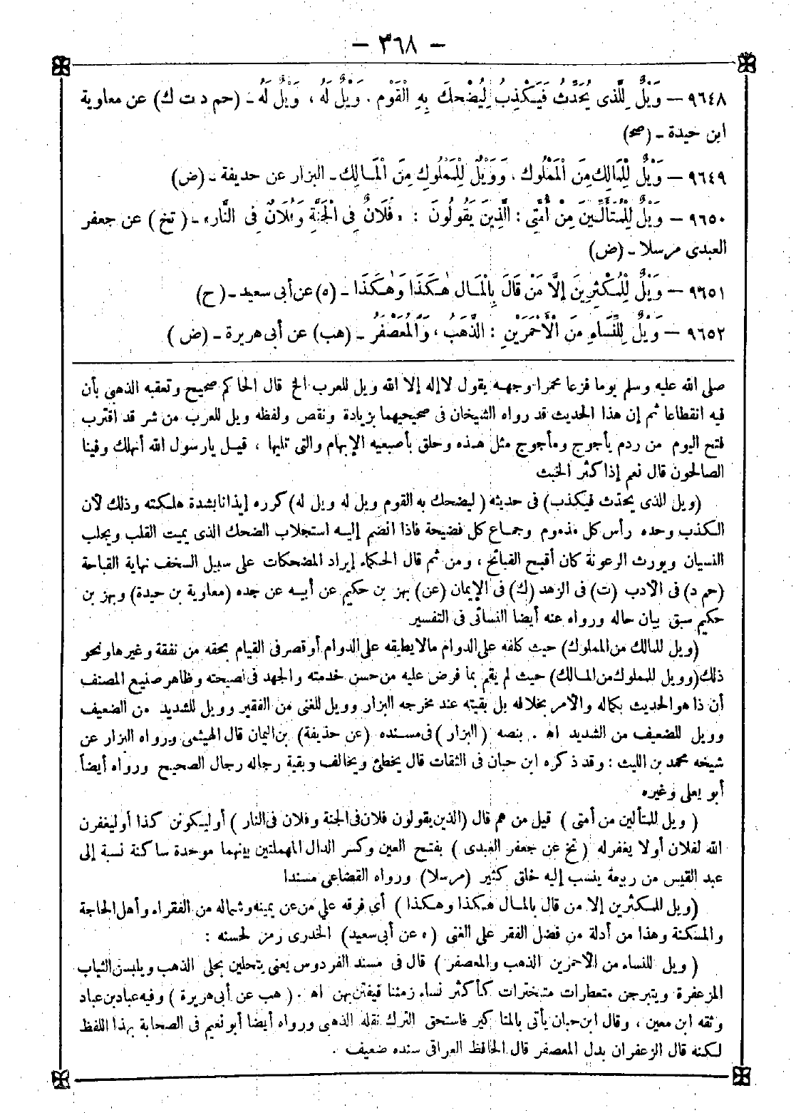 9648 - (ويل للذي يحدث فيكذب) في حديثه (ليضحك به القوم ويل له ويل له) كرره إيذانا بشدة هلكته وذلك لأن الكذب وحده رأس كل مذموم وجماع كل فضيحة فإذا انضم إليه استجلاب الضحك الذي يميت القلب ويجلب النسيان ويورث الرعونة كان أقبح القبائح ومن ثم قال الحكماء: إيراد المضحكات على سبيل السخف نهاية القباحة