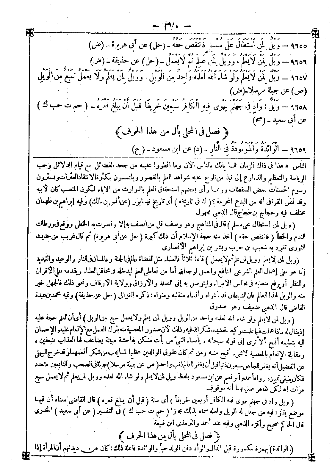 9656 - (ويل لمن لا يعلم وويل لمن علم ثم لا يعمل) قالها ثلاثا فالعلماء مثل القضاة عالم في الجنة وعالمان في النار والوعيد والتهديد إنما هو على إهمال العلم الشرعي النافع والعمل لوجه الله أما من تعاطى العلم ليدخله في محافل العلماء ويقدمه على الأقران والنظر أو يرفع منصبه في مجالس الأمراء وليتوصل به إلى الصلة والأرزاق وولاية الأوقاف ونحو ذلك فالجهل خير منه والويل لهذا العالم فإن الشيطان قد أغواه وأنساه متقلبه ومثواه ذكره الغزالي
