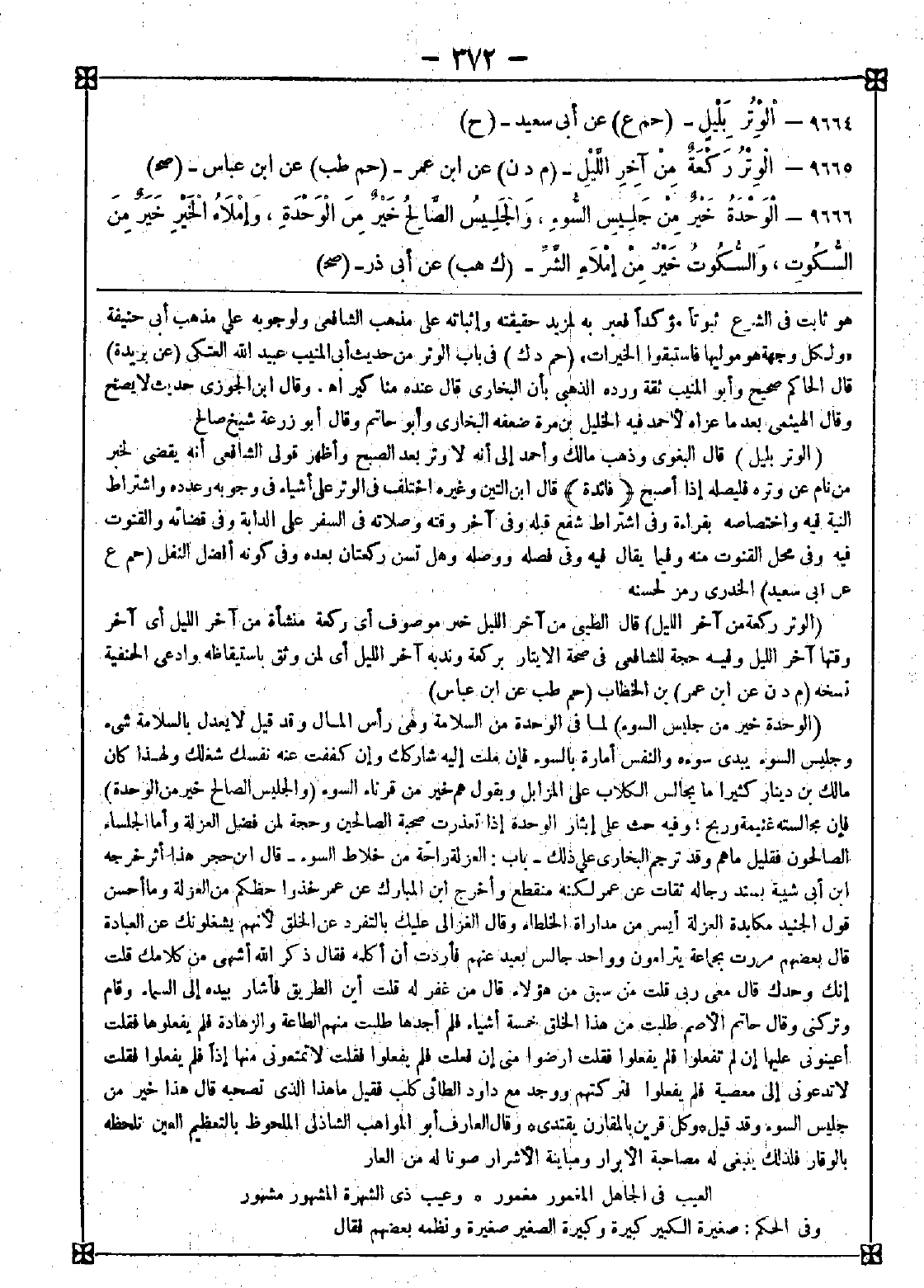 9664 - (الوتر بليل) قال البغوي: وذهب مالك وأحمد إلى أنه لا وتر بعد الصبح وأظهر قولي الشافعي أنه يقضى لخبر من نام عن وتره فليصله إذا أصبح