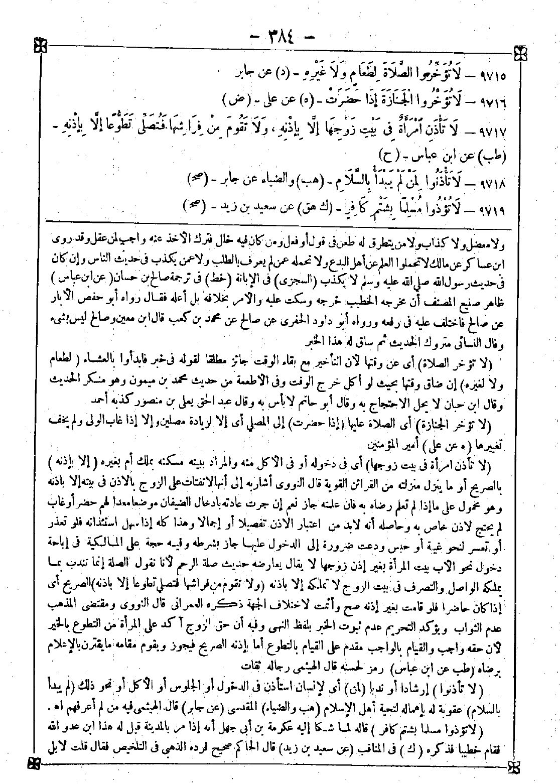 9718 - (لا تأذنوا) إرشادا أو ندبا (لمن) أي لإنسان استأذن في الدخول أو الجلوس أو الأكل أو نحو ذلك (لم يبدأ بالسلام) عقوبة له بإهماله لتحية أهل الإسلام