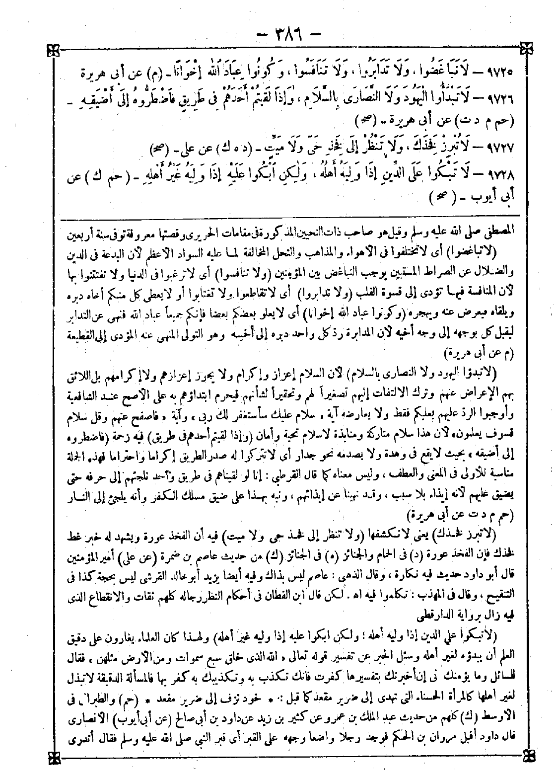 9725 - (لا تباغضوا) أي لا تختلفوا في الأهواء والمذاهب والنحل المخالفة لما عليه السواد الأعظم لأن البدعة في الدين والضلال عن الصراط المستبين يوجب التباغض بين المؤمنين (ولا تنافسوا) أي لا ترغبوا في الدنيا ولا تفتتنوا بها لأن المنافسة فيها تؤدي إلى قسوة القلب (ولا تدابروا) أي لا تقاطعوا ولا تغتابوا أو لا يعطى كل منكم أخاه دبره ويلقاه فيعرض عنه ويهجره (وكونوا عباد الله إخوانا) أي لا يعلو بعضكم بعضا فإنكم جميعا عباد الله فنهى عن التدابر ليقبل كل بوجهه إلى وجه أخيه لأن المدابرة رد كل واحد دبره إلى أخيه وهو التولي المنهي عنه المؤدي إلى القطيعة