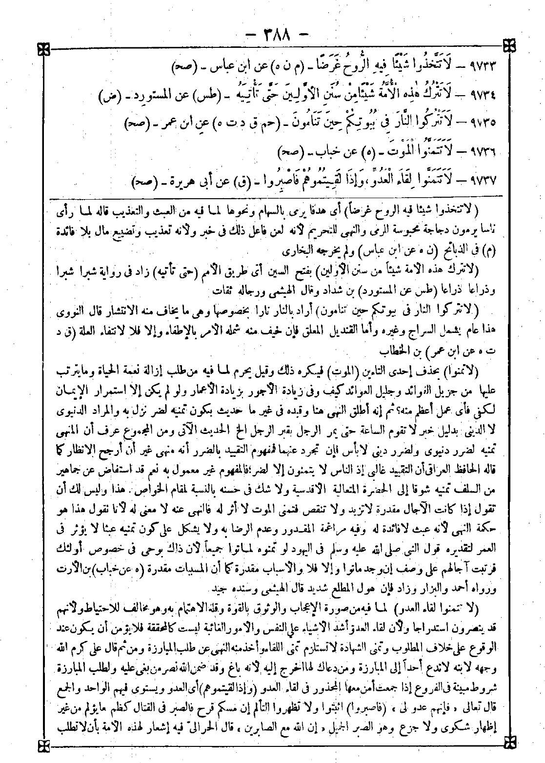 9736 - (لا تمنوا) بحذف إحدى التاءين (الموت) فيكره ذلك وقيل يحرم لما فيه من طلب إزالة نعمة الحياة وما يترتب عليها من جزيل الفوائد وجليل العوائد كيف وفي زيادة الأجور بزيادة الأعمار ولو لم يكن إلا استمرار الإيمان لكفى فأي عمل أعظم منه؟ ثم إنه أطلق النهي هنا وقيده في غير ما حديث بكون تمنيه لضر نزل به والمراد الدنيوي لا الديني بدليل خبر لا تقوم الساعة حتى يمر الرجل بقبر الرجل إلخ الحديث الآتي ومن المجموع عرف أن المنهي تمنيه لضرر دنيوي ولضرر ديني لا بأس فإن تجرد عنهما فمفهوم التقييد بالضرر أنه منهي غير أن أرجح الأنظار كما قاله الحافظ العراقي أن التقييد غالبي إذ الناس لا يتمنون إلا لضر فالمفهوم غير معمول به نعم قد استفاض عن جماهير من السلف تمنيه شوقا إلى الحضرة المتعالية الأقدسية ولا شك في حسنه بالنسبة لمقام الخواص. هذا وليس لك أن تقول إذا كانت الآجال مقدرة لا تزيد ولا تنقص فتمني الموت لا أثر له فالنهي عنه لا معنى له لأنا نقول هذا هو حكمة النهي لأنه عبث لا فائدة له وفيه مراغمة المقدور وعدم الرضا به ولا يشكل على كون تمنيه عبثا لا يؤثر في العمر لتقديره قول النبي صلى الله عليه وسلم في اليهود لو تمنوه لماتوا جميعا لأن ذاك بوحي في خصوص أولئك فرتبت آجالهم على وصف إن وجد ماتوا وإلا فلا والأسباب مقدرة كما أن المسببات مقدرة