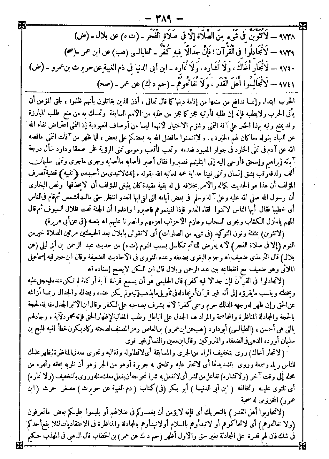 9739 - (لا تجادلوا في القرآن فإن جدالا فيه كفر) قال الحليمي: هو أن يسمع قراءة آية أو كلمة لم تكن عنده فيعجل عليه ويخطئه وينسب ما يقرؤه إلى أنه غير قرآن أو يجادله في تأويل ما يذهب إليه ولم يكن عنده ويضلله والجدال ربما أزاغه عن الحق وإن ظهر له وجهه فلذلك حرم وسمي كفرا لأنه يشرف بصاحبه على الكفر وقال ابن الأثير: الجدل مقابلة الحجة بالحجة والمجادلة المناظرة والمخاصمة والمراد هنا الجدل على الباطل وطلب المغالبة لإظهار الحق فإنه محمود لآية {وجادلهم بالتي هي أحسن}