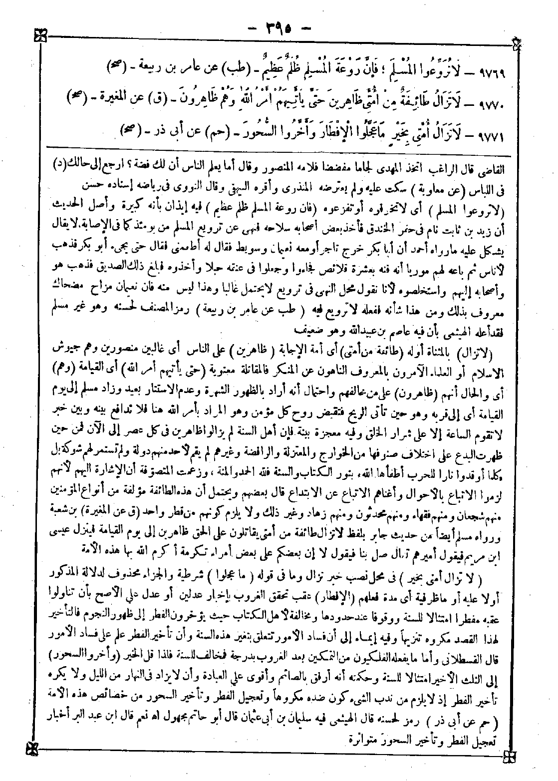 9770 - (لا تزال) بالمثناة أوله (طائفة من أمتي) أي أمة الإجابة (ظاهرين) على الناس أي غالبين منصورين وهم جيوش الإسلام أو العلماء الآمرون بالمعروف الناهون عن المنكر فالمقاتلة معنوية (حتى يأتيهم أمر الله) أي القيامة (وهم) أي والحال أنهم (ظاهرون) على من خالفهم واحتمال أنه أراد بالظهور الشهرة وعدم الاستتار بعيد وزاد مسلم إلى يوم القيامة أي إلى قربه وهو حيت تأتي الريح فتقبض روح كل مؤمن وهو المراد بأمر الله هنا فلا تدافع بينه وبين خبر لا تقوم الساعة إلا على شرار الخلق وفيه معجزة بينة فإن أهل السنة لم يزالوا ظاهرين في كل عصر إلى الآن فمن حين ظهرت البدع على اختلاف صنوفها من الخوارج والمعتزلة والرافضة وغيرهم لم يقم لأحد منهم دولة ولم تستمر لهم شوكة بل {كلما أوقدوا نارا للحرب أطفأها الله} بنور الكتاب والسنة فلله الحمد والمنة وزعمت المتصوفة أن الإشارة إليهم لأنهم لزموا الاتباع بالأحوال وأغناهم الاتباع عن الابتداع قال بعضهم: ويحتمل أن هذه الطائفة مؤلفة من أنواع المؤمنين منهم شجعان ومنهم فقهاء ومنهم محدثون ومنهم زهاد وغير ذلك ولا يلزم كونهم من قطر واحد