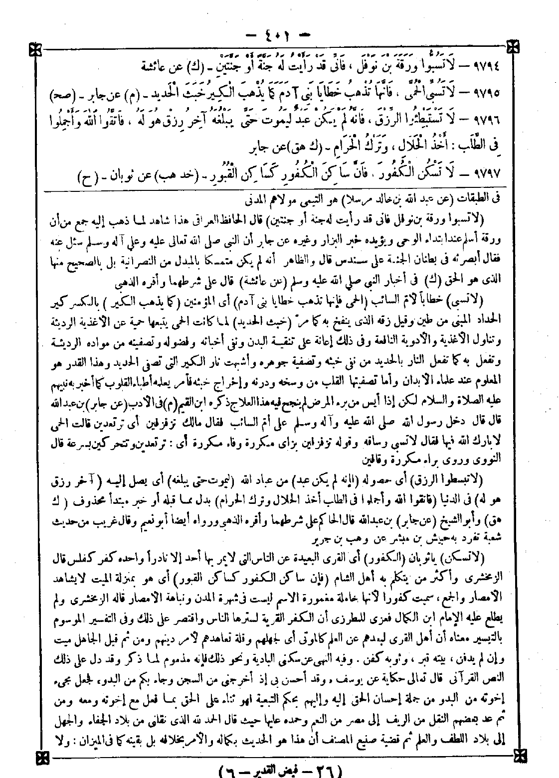 9794 - (لا تسبوا ورقة بن نوفل فإني قد رأيت له جنة أو جنتين) قال الحافظ العراقي: هذا شاهد لما ذهب إليه جمع من أن ورقة أسلم عند ابتداء الوحي ويؤيده خبر البزار وغيره عن جابر أن النبي صلى الله تعالى عليه وعلى آله وسلم سئل عنه فقال: أبصرته في بطنان الجنة على سندس قال: والظاهر أنه لم يكن متمسكا بالمبدل من النصرانية بل بالصحيح منها الذي هو الحق