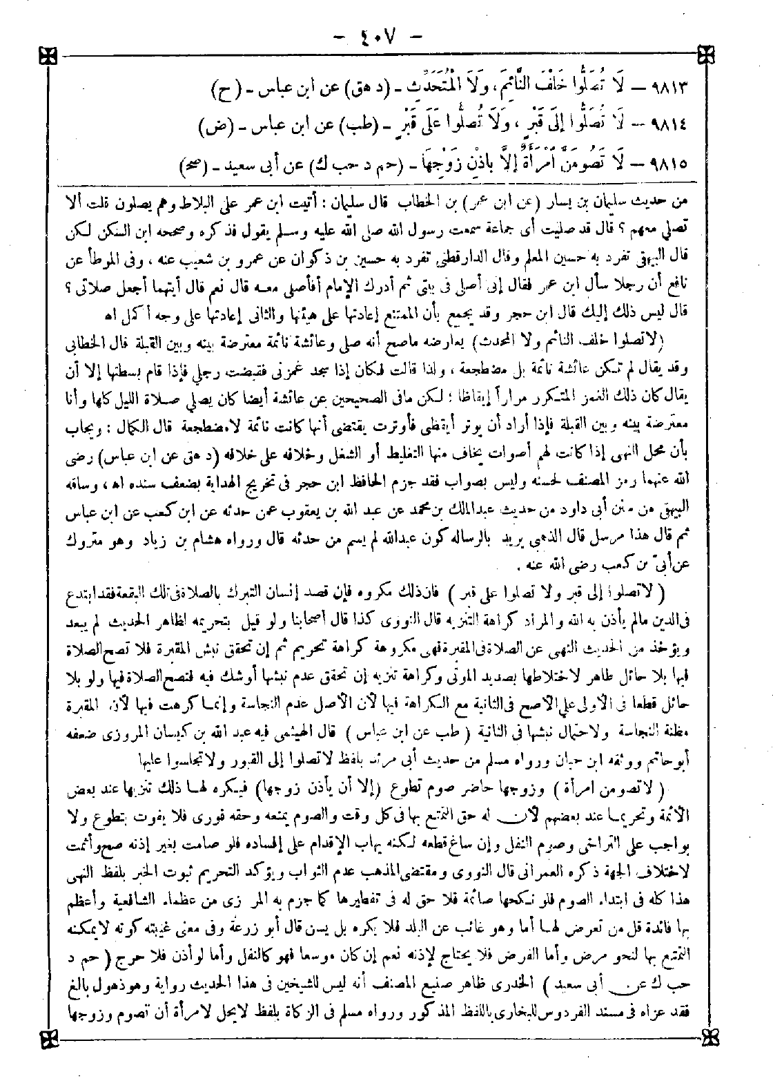 9814 - (لا تصلوا إلى قبر ولا تصلوا على قبر) فإن ذلك مكروه فإن قصد إنسان التبرك بالصلاة في تلك البقعة فقد ابتدع في الدين ما لم يأذن به الله والمراد كراهة التنزيه قال النووي: كذا قال أصحابنا ولو قيل بتحريمه لظاهر الحديث لم يبعد ويؤخذ من الحديث النهي عن الصلاة في المقبرة فهي مكروهة كراهة تحريم ثم إن تحقق نبش المقبرة فلا تصح الصلاة فيها بلا حائل طاهر لاختلاطها بصديد الموتى وكراهة تنزيه إن تحقق عدم نبشها أو شك فيه فتصح الصلاة فيها ولو بلا حائل قطعا في الأولى على الأصح في الثانية مع الكراهة فيها لأن الأصل عدم النجاسة وإنما كرهت فيها لأن المقبرة مظنة النجاسة ولاحتمال نبشها في الثانية