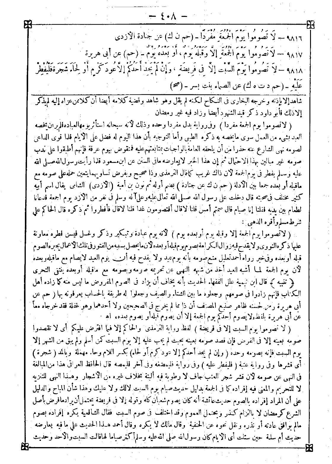9817 - (لا تصوموا يوم الجمعة إلا وقبله يوم أو بعده يوم) لأنه يوم عبادة وتبكير وذكر غسل فيسن فطره معاونة عليها ذكره النووي ولا يقدح فيه زوال الكراهة بصوم يوم قبله أو بعده لأن ما يحصل بسببه من الفتور في تلك الأعمال يجبره الصوم قبله أو بعده وفي خبر رواه أحمد تعليل منع صومه بأنه يوم عيد ولا يقدح فيه أن يوم العيد لا يصام مع ما قبله وبعده لأن يوم الجمعة لما أشبه العيد أخذ من شبهه النهي عن تحريمه صومه وبصومه مع ما قبله أو بعده ينتفي التحري