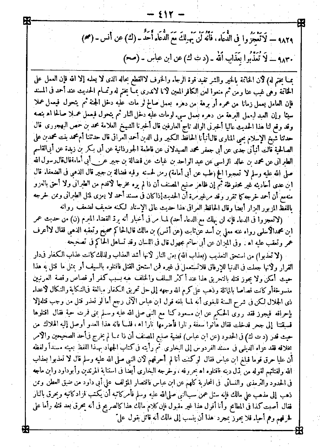 9830 - (لا تعذبوا) من استحق التعذيب (بعذاب الله) يعني النار لأنها أشد العذاب ولذلك كانت عذاب الكفار في دار القرار ولأنها جعلت في الدنيا للإرفاق فلا تستعمل في غيره فمن استحق القتل فاقتلوه بالسيف أو بمثل ما قتل به هذا حيث أمكن ولا يجوز قتله بالتحريق هذا عند أكثر السلف والخلف هبه بسبب كفر أو قصاص وقصة العرنيين منسوخة أو كانت قصاصا بالمماثلة وذهب علي كرم الله وجهه إلى حل تحريق الكفار مبالغة في النكاية والنكال لأعداء ذي الجلال لكن في شرح السنة للبغوي أنه لما بلغه قول ابن عباس الآتي رجع أما لو تعذر قتل من وجب قتله إلا بإحراقه فيجوز فقد روى الحكيم عن ابن مسعود كنا مع النبي صلى الله عليه وسلم بمنى فمرت حية فقال اقتلوها فسبقتنا إلى جحر فدخلت فقال هاتوا سعفة ونارا فأضرمها نارا اه فلما فاته هذا العدو أوصل إليه الهلاك من حيث قدر
