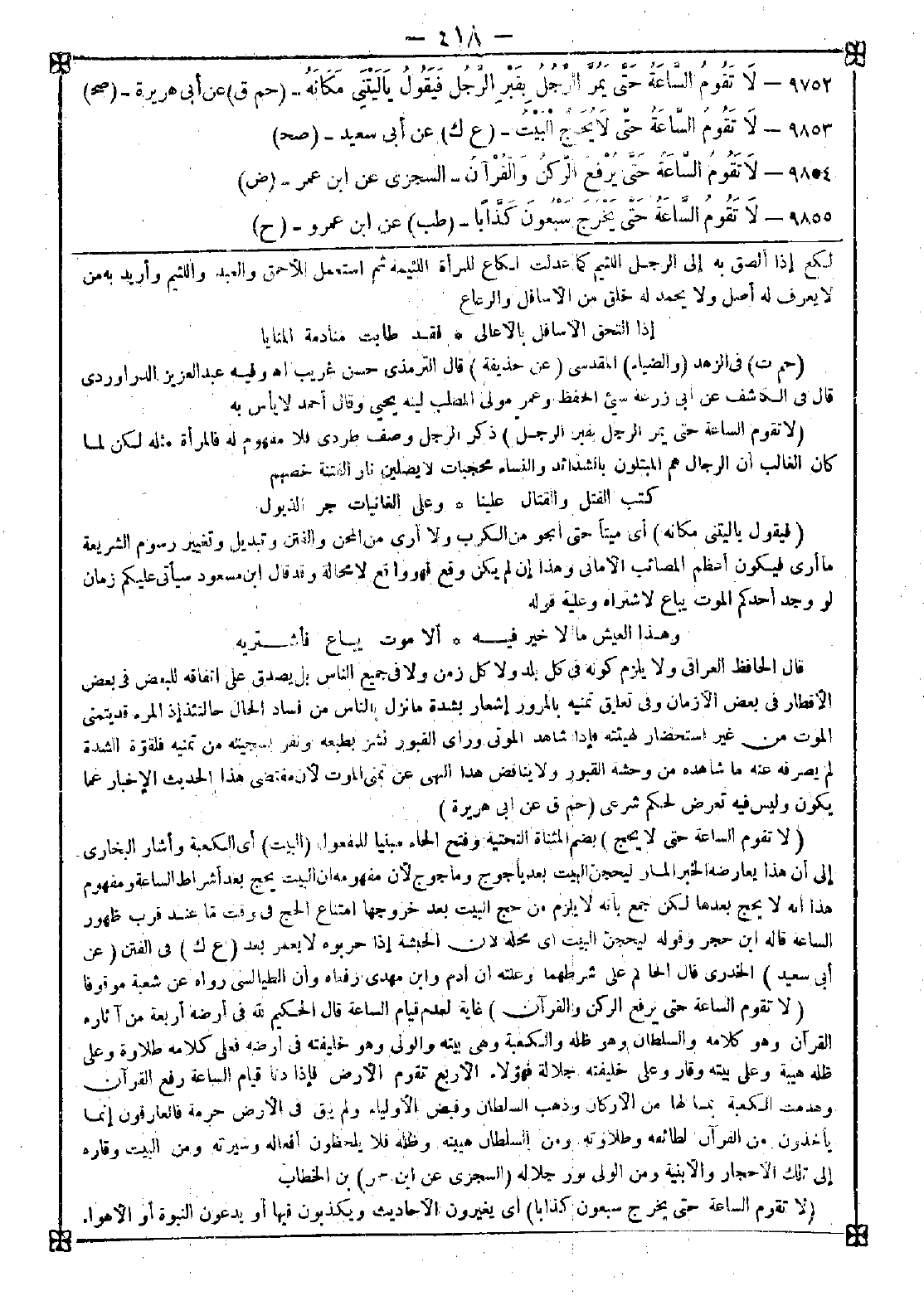 9854 - (لا تقوم الساعة حتى يرفع الركن والقرآن) غاية لعدم قيام الساعة قال الحكيم: لله في أرضه أربعة من آثاره القرآن وهو كلامه والسلطان وهو ظله والكعبة وهي بيته والولي وهو خليفته في أرضه فعلى كلامه طلاوة وعلى ظله هيبة وعلى بيته وقار وعلى خليفته جلالة فهؤلاء الأربع تقوم الأرض فإذا دنا قيام الساعة رفع القرآن وهدمت الكعبة بما لها من الأركان وذهب السلطان وقبض الأولياء ولم يبق في الأرض حرمة فالعارفون إنما يأخذون من القرآن لطائفه وطلاوته ومن السلطان هيبته وظله فلا يلحظون أفعاله وسيرته ومن البيت وقاره إلى تلك الأحجار والأبنية ومن الولي نور جلاله