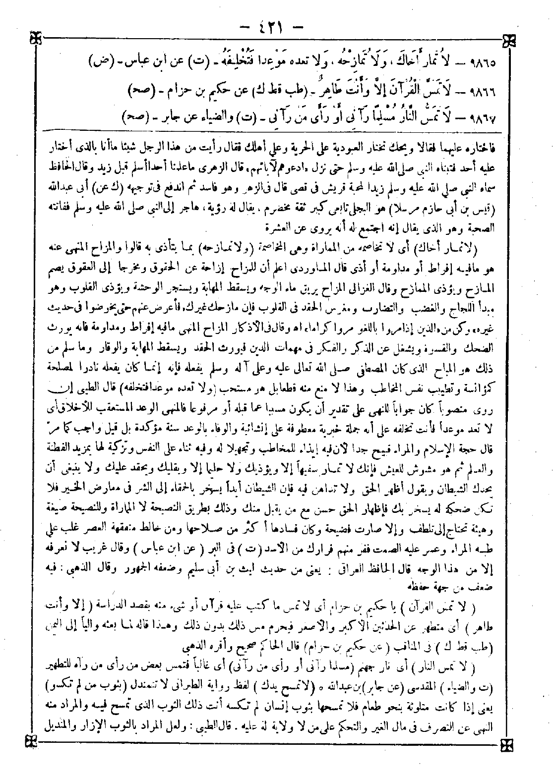 9866 - (لا تمس القرآن) يا حكيم بن حزام أي لا تمس ما كتب عليه قرآن أو شيء منه بقصد الدراسة (إلا وأنت طاهر) أي متطهر عن الحدثين الأكبر والأصغر فيحرم مس ذلك بدون ذلك وهذا قاله لما بعثه واليا إلى اليمن