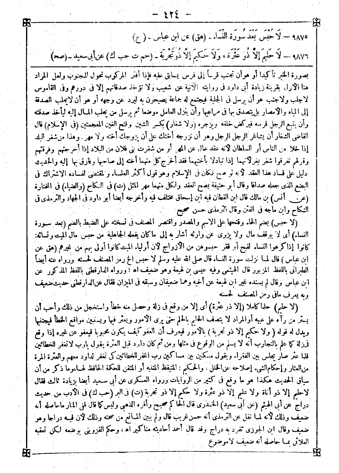 9875 - (لا حبس) بضم الحاء وفتحها على الاسم والمصدر واقتصر المصنف في نسخته على الضبط بالضم (بعد سورة النساء) أي لا يوقف مال ولا يزوى عن وارثه أشار به إلى ما كان يفعله الجاهلية من حبس مال الميت ونسائه: كانوا إذا كرهو النساء لقبح أو فقر حبسوهن من الأزواج لأن أولياء الميت كانوا أولى بهم من غيرهم