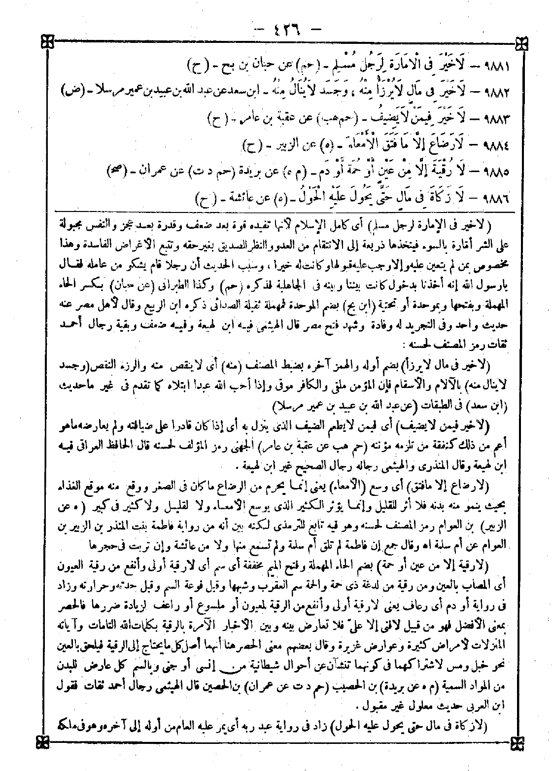 9885 - (لا رقية إلا من عين أو حمة) بضم الحاء المهملة وفتح الميم مخففة أي سم أي لا رقية أولى وأنفع من رقية العيون أي المصاب بالعين ومن رقية من لدغة ذي حمة والحمة سم العقرب وشبهها وقيل فوعة السم وقيل حدته وحرارته وزاد في رواية أو دم أو رعاف يعني لا رقية أولى وأنفع من الرقية لمعيون أو ملسوع أو راعف لزيادة ضررها فالحصر بمعنى الأفضل فهو من قبيل لا فتى إلا علي فلا تعارض بينه وبين الأخبار الآمرة بالرقية بكلمات الله التامات وآياته المنزلات لأمراض كثيرة وعوارض غزيرة وقال بعضهم: معنى الحصر هنا أنهما أصل كل ما يحتاج إلى الرقية فيلحق بالعين نحو خبل ومس لاشتراكهما في كونهما تنشآن عن أحوال شيطانية من إنسي أو جني وبالسم كل عارض للبدن من المواد السمية