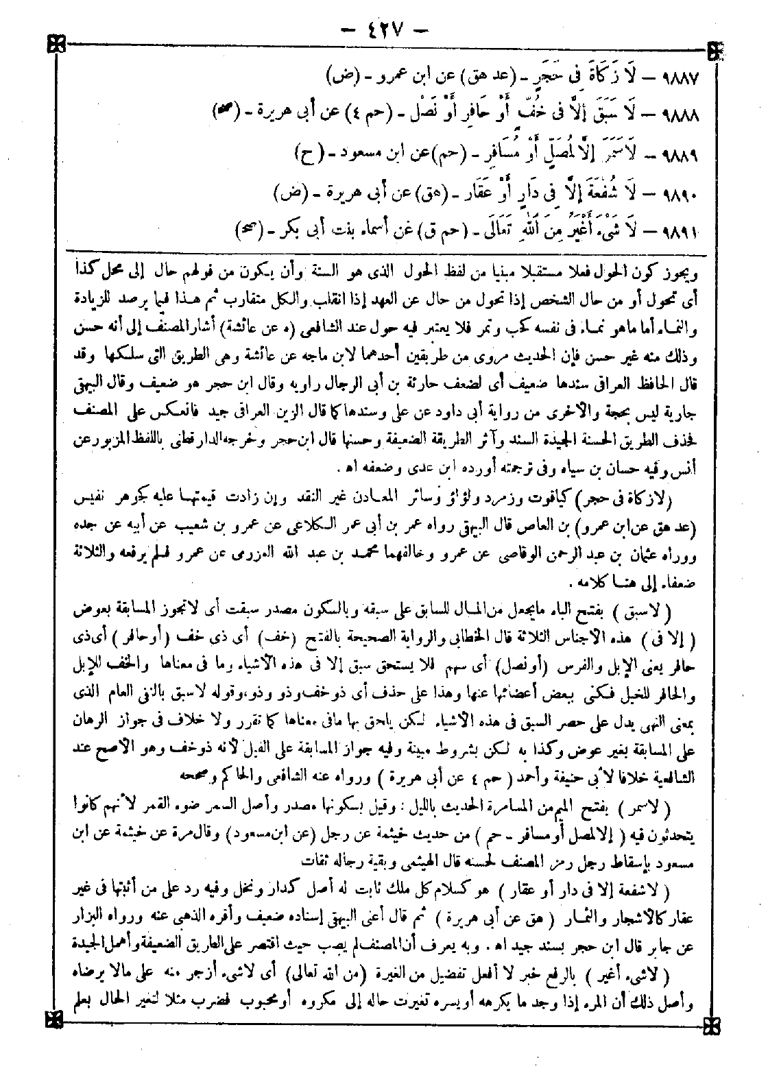 9890 - (لا شفعة إلا في دار أو عقار) هو كسلام كل ملك ثابت له أصل كدار ونخل وفيه رد على من أثبتها في غير عقار كالأشجار والثمار