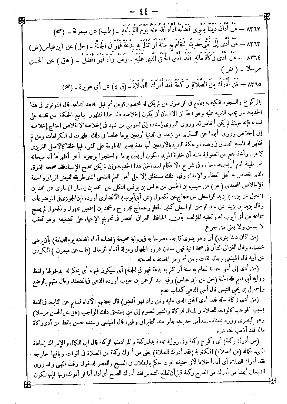 8365 - (من أدرك ركعة) أي ركوع ركعة وفي رواية سجدة بدل ركعة والمراد منها الركعة قال ابن الكمال: والإدراك إحاطة الشيء بكماله (من الصلاة) المكتوبة (فقد أدرك الصلاة) يعني من أدرك ركعة من الصلاة في الوقت وباقيها خارجه فقد أدرك الصلاة أي أداءا خلافا لأبي حنيفة حيث حكم بالبطلان في الصبح والعصر لدخول وقت النهي وقد روى الشيخان أيضا من أدرك من الصبح ركعة قبل أن تطلع الشمس فقد أدرك الصبح أي أداءا أما لو أدرك دونها فإنها تكون -[45]- قضاء والفرق أن الركعة تشتمل على معظم أفعال الصلاة إذ معظم الباقي كالتكرير لها فجعل ما بعد الوقت تابعا لها بخلاف ما دونها هذا هو الصحيح عند الشافعية وقيل: تكون قضاء مطلقا وقيل: ما وقع بعدها قضاء وما قبله أداء