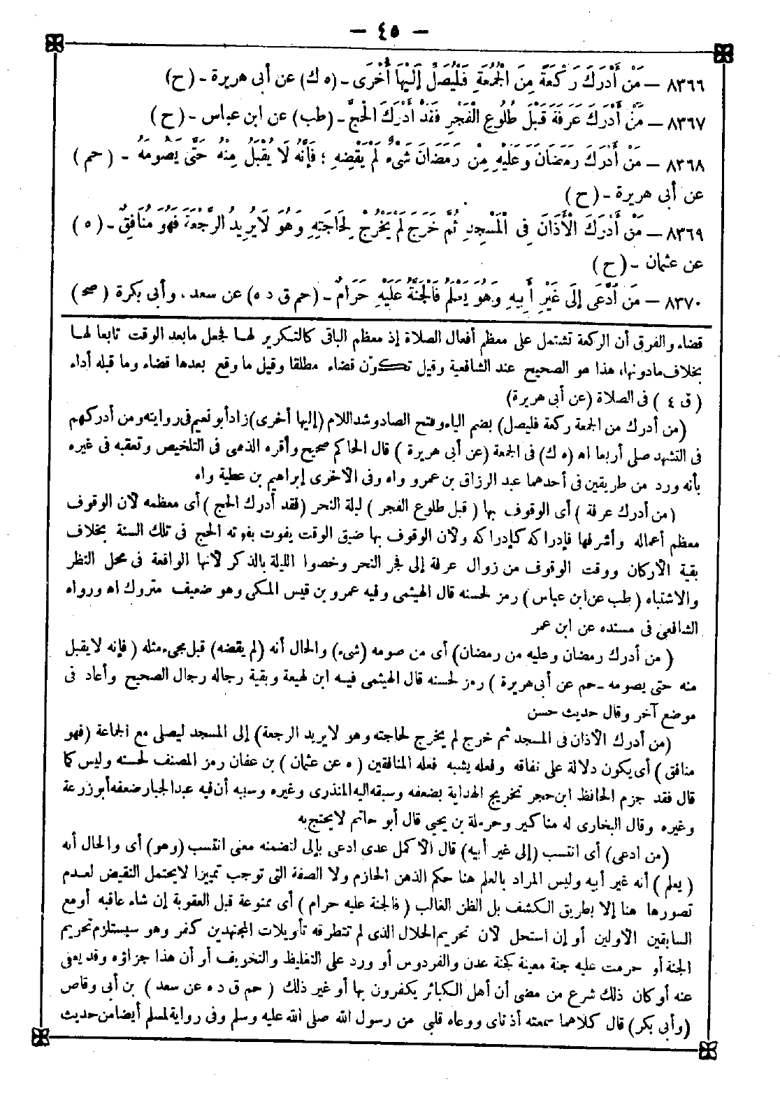 8367 - (من أدرك عرفة) أي الوقوف بها (قبل طلوع الفجر) ليلة النحر (فقد أدرك الحج) أي معظمه لأن الوقوف معظم أعماله وأشرفها فإدراكه كإدراكه ولأن الوقوف بها ضيق الوقت يفوت بفوته الحج في تلك السنة بخلاف بقية الأركان ووقت الوقوف من زوال عرفة إلى فجر النحر وخصوا الليلة بالذكر لأنها الواقعة في محل النظر والاشتباه