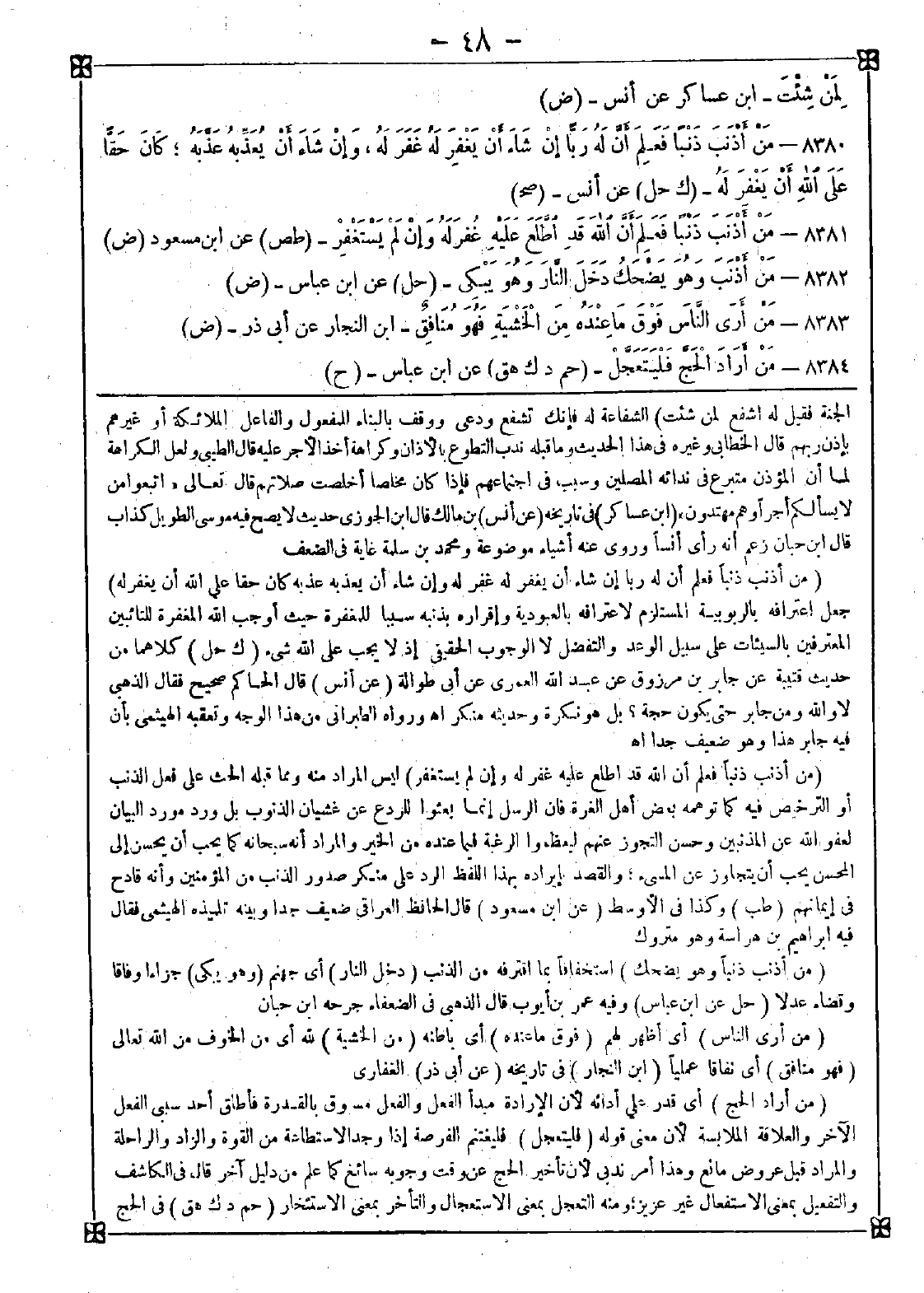 8382 - (من أذنب ذنبا وهو يضحك) استخفافا بما اقترفه من الذنب (دخل النار) أي جهنم (وهو يبكي) جزاءا وفاقا وقضاءا عدلا