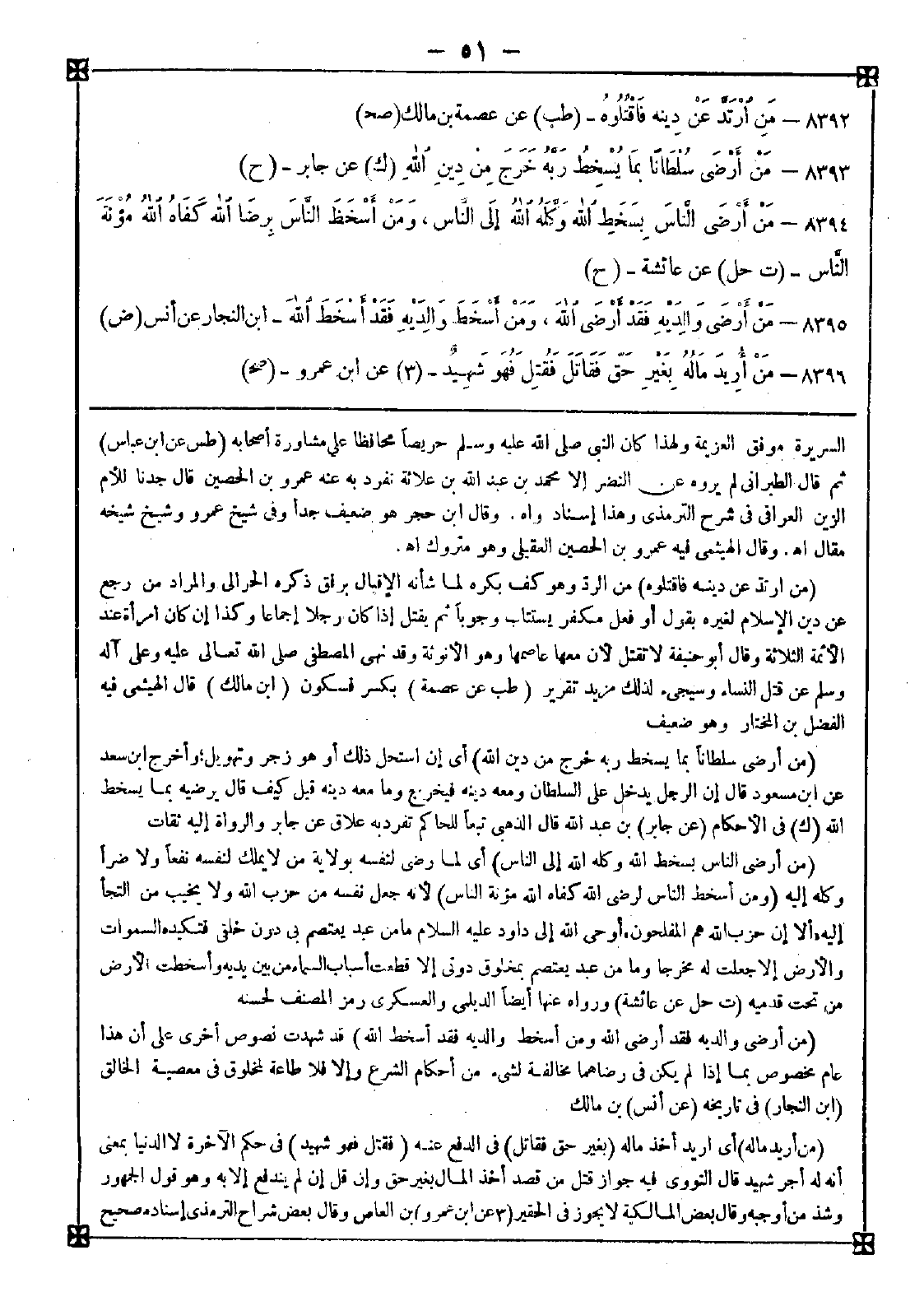 8392 - (من ارتد عن دينه فاقتلوه) من الرد وهو كف بكره لما شأنه الإقبال برفق. ذكره الحرالي. والمراد من رجع عن دين الإسلام لغيره بقول أو فعل مكفر يستتاب وجوبا ثم يقتل إذا كان رجلا إجماعا وكذا إن كان أمرأة عند الأئمة الثلاثة وقال أبو حنيفة: لا تقتل لأن معها عاصمها وهو الأنوثة وقد نهى المصطفى صلى الله تعالى عليه وعلى آله وسلم عن قتل النساء وسيجيء لذلك مزيد تقرير